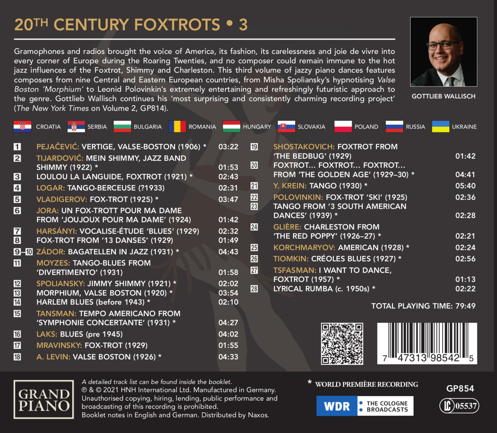 Grammophone und Radios brachten in den Roaring Twenties den Lifestyle, die Mode, Sorglosigkeit und Lebensfreude des frühen amerikanischen Jazz in jeden Winkel Europas. Kein Komponist konnte sich den Einflüssen von Foxtrott, Shimmy und Charleston entziehen. In diesem dritten Volumen mit jazzigen Klaviernummern sind Komponisten aus neun mittel- und osteuropäischen Ländern vertreten, von Mischa Spolianskys hypnotisierendem ‚Bostoner Walzer‘ „Morphium“ bis zu Dmitri Schostakowitschs „Foxtrott… Foxtrott… Foxtrott…“ aus dem Ballett „Das goldene Zeitalter“. Gottlieb Wallisch setzt mit diesem Album sein „überraschendes und durchweg charmantes Aufnahmeprojekt“ (The New York Times) fort.