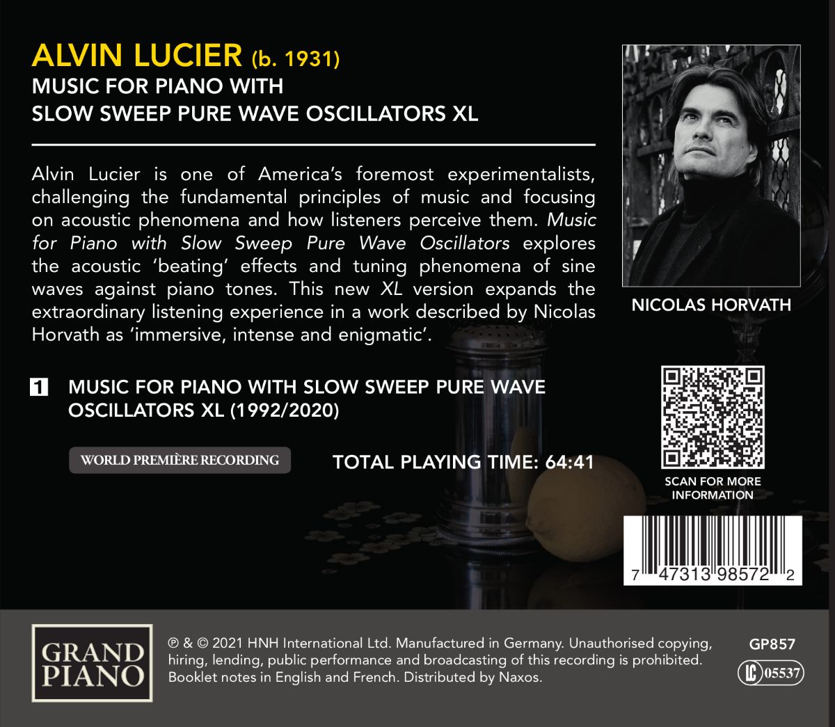 „Music for Piano with Slow Sweep Pure Wave Oscillators“ erforscht die akustischen ‚Schwebeeffekte‘ und Stimmphänomene von Sinuswellen in Verbindung mit Klaviertönen. Diese neue XL-Version erweitert das außergewöhnliche Hörerlebnis des ursprünglichen Werks auf die vierfache Länge. Die für Nicolas Horvath geschriebene XL-Fassung beschreibt dieser als „eindringlich, intensiv und rätselhaft wie Kubricks schwarzer Monolith aus 2001“.