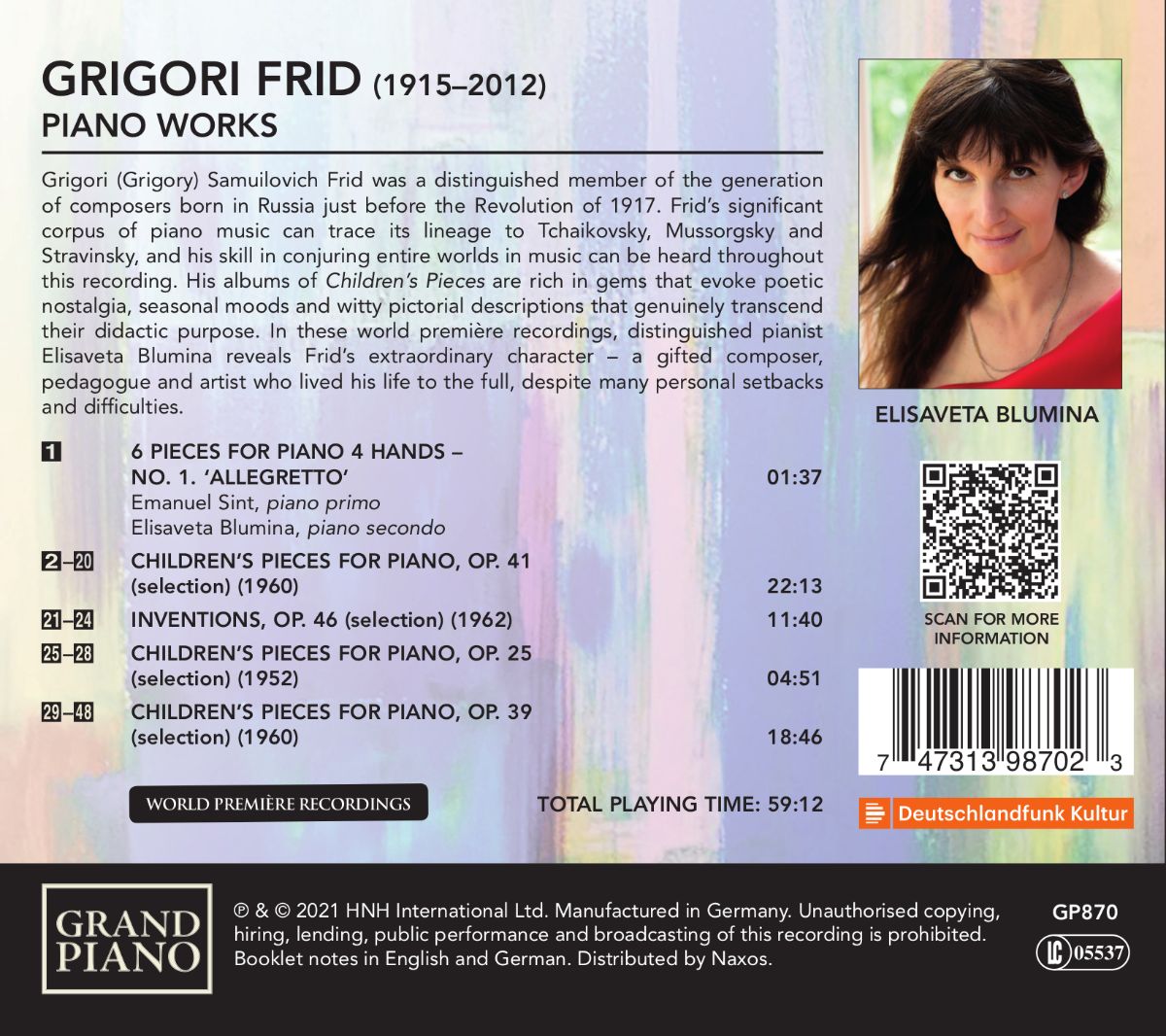 Beevor Grigori Frid (1915–2012) sich der Avantgarde zuwandte und den berühmt-berüchtigten Moskauer Jugend-Musik-Klub 1965 gründete, in dem (natürlich inoffiziell) neue Werke russischer Avantgardisten vorgestellt wurden, tat sich als Komponist origineller Klavierminiaturen für die Jugend in drei Sammlungen an „Kinderstücken“ hervor. Sie verweisen auf seine vielfältigen musikalischen Einflüsse von Tschaikowsky und Mussorgsky über Ravel bis hin zu Strawinsky und Prokofjew. Die kleinen poetischen Kleinode für das Klavier gehen weit über ihren eigentlich didaktischen Zweck hinaus.