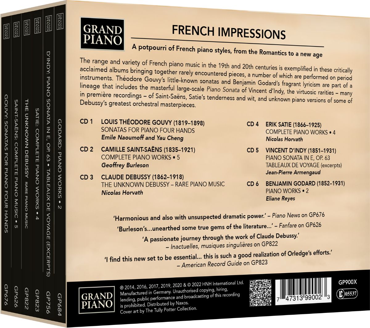 Die Sammelbox „French Impressions“ fasst in sechs Alben die Bandbreite und Vielfalt der französischen Klaviermusik des 19. und 20. Jahrhunderts zusammen. Sie vereint vornehmlich selten gespieltes Repertoire, das teilweise auf historischen Instrumenten gespielt wird. Zu hören sind Théodore Gouvys Sonaten und die zarte Poesie Lyrik von Benjamin Godard. Die monumentale Klaviersonate von Vincent d'Indy und die virtuosen Raritäten von Camille Saint-Saëns sind ebenso enthalten wie Erik Saties schlichte Zartheit und feine Ironie sowie unbekannte Klavierversionen einiger der größten orchestralen Meisterwerke Claude Debussys.