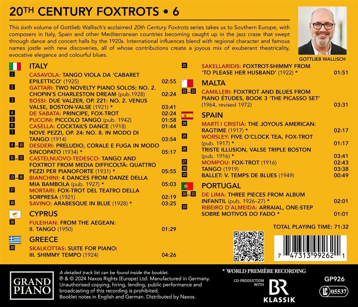 Der sechste Teil von Gottlieb Wallischs gefeierter Reihe „20th Century Foxtrots“ führt nach Südeuropa, wo Komponisten in Italien, Spanien, Portugal, Griechenland und sogar Malta und Zypern vom weltweit grassierenden Jazz-Fieber angesteckt wurden und mit ihrer Lesart die dortigen Tanz- und Konzertsäle eroberten. Internationale Einflüsse mischen sich mit landestypischen Elementen; berühmte Namen (Puccini, Castelnuovo-Tedesco, Mompou) treffen auf Neuentdeckungen (bspw. Sakellaridis, Camilleri, Fuleihan). Die Nummern sind fröhlich, farbenfroh, voller Theatralik und betörender Eleganz.