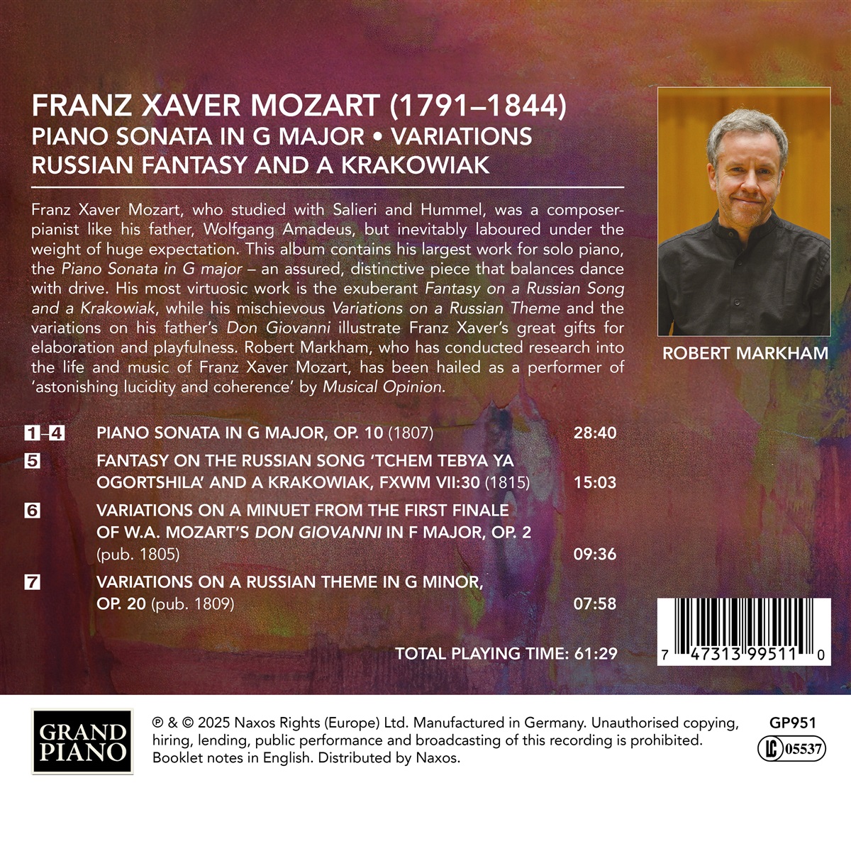 Dies ist das zweite Album von Robert Markhams Gesamtaufnahme der Klavierwerke von Franz Xaver Mozart. Der junge Mozart, der bei Salieri und Hummel studierte, war wie sein Vater Wolfgang Amadeus Komponist und Pianist, stand aber unweigerlich unter dem Druck großer Erwartungen. Dieses Album enthält sein umfangreichstes Werk für Soloklavier, die Klaviersonate in G-Dur, ein selbstbewusstes, charakteristisches Stück, das Tanz und Schwung in Einklang bringt. Sein virtuosestes Werk ist die überschwängliche „Fantasie über ein russisches Lied“ und ein Krakowiak, während seine schelmischen Variationen über ein russisches Thema und die Variationen über den „Don Giovanni“ seines Vaters Franz Xavers große Begabung für Ausarbeitung und Verspieltheit veranschaulichen. Robert Markham, der das Leben und die Musik von Franz Xaver Mozart erforscht hat, wurde als Interpret von erstaunlicher Klarheit und Kohärenz gelobt.