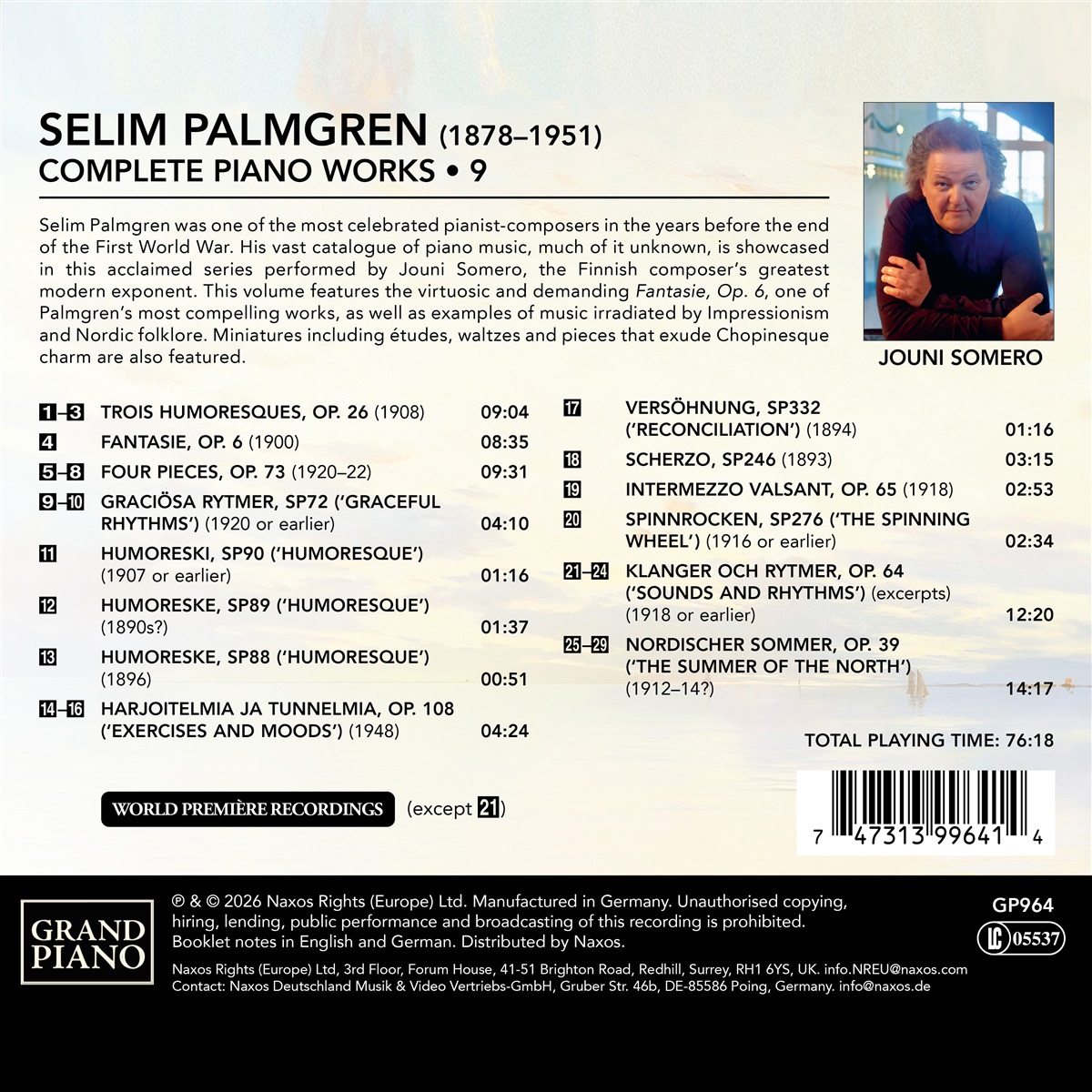 Selim Palmgren war einer der berühmtesten Pianisten und Komponisten in den Jahren vor dem Ende des Ersten Weltkriegs. Sein umfangreiches, größtenteils unbekanntes Klavierwerk wird in dieser hochgelobten Reihe von Jouni Somero, dem größten modernen Vertreter des finnischen Komponisten, vorgestellt – es handelt sich um die erste vollständige Einspielung seiner Klaviermusik. Dieser Teil, der bereits neunte der Reihe, enthält die virtuose und anspruchsvolle Fantasie op. 6, eines der fesselndsten Werke Palmgrens, sowie Beispiele von Musik, die vom Impressionismus und der nordischen Folklore beeinflusst ist. Auch Miniaturen wie Etüden, Walzer und Stücke mit chopineskem Charme stehen auf dem Programm. Bei den meisten Stücken handelt es sich um Weltersteinspielungen. Jouni Somero ist einer der aktivsten Interpreten unter den finnischen Musikern der Gegenwart. Er hat über 3.500 Konzerte in vielen Ländern der Welt gegeben. Er studierte Klavier in der Schweiz und an der Musikhochschule Köln bei Professor Herbert Drechsel, und bei dem legendären ungarischen Pianisten Georges Cziffra vertiefte er seine Kenntnisse in der Interpretation der Musik von Franz Liszt. Michael Ponti, der amerikanische Virtuose, war ebenfalls als musikalischer Berater Someros tätig. Jouni Someros Aufnahmekarriere begann 1989 (mit Liszts 12 Transzendentalen Etüden), seitdem hat er mehr als 100 Aufnahmen für verschiedene Labels gemacht. Sein breit gefächertes Repertoire umfasst sämtliche Soloklavierwerke von Sergei Rachmaninow, Piotr Tschaikowsky und Sergei Bortkiewicz sowie selten zu hörende Musik von u. a. Charles-Valentin Alkan, Leopold Godowsky, Anton Rubinstein, Hugo Reinhold, Benjamin Godard, César Cui und Louis Moreau Gottschalk. Er hat auch mehrere Klavierarrangements von Orchester-, Opern- und Popmusik gemacht, und sein YouTube-Kanal wurde bereits millionenfach aufgerufen.
