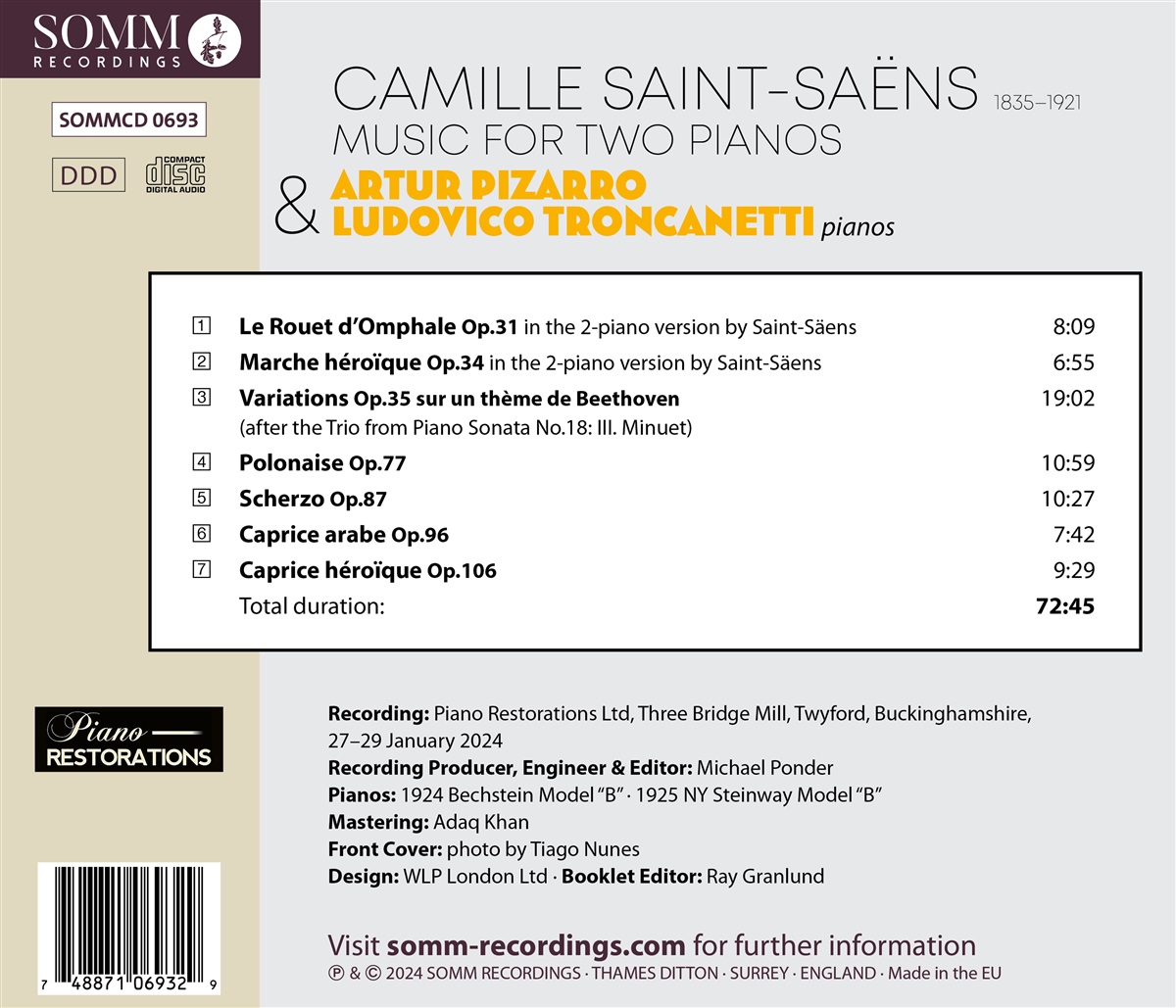 Das Werk des französischen Pianisten und Komponisten Camille Saint-Saëns (1835–1921) für Solo- und Duopianisten umfasst fast 200 Kompositionen. Das Programm dieser Veröffentlichung enthält Originalwerke für zwei Klaviere sowie eine Auswahl von Saint-Saëns transkribierten Orchesterstücken. Die Pianisten, Artur Pizarro und Ludovico Troncanetti, gaben 2023 in Lissabon ihr Debüt als Klavierduo mit einem Rezital, das das Repertoire dieses Albums enthielt. Die Künstler verbindet die Liebe zur Aufführung von Repertoire für zwei Klaviere und vierhändig und sie planen, ihre Zusammenarbeit mit weiteren Projekten auf der Bühne und im Studio fortzusetzen. Zu hören sind Saint-Saëns' Transkription von „Le Rouet d'Omphale“ das, ebenso wie die „Marche héroïque“ in der Originalversion für zwei Klaviere uraufgeführt wird. Das erste und umfangreichste der beiden Originalwerke für zwei Klaviere von Saint-Saëns ist eine Reihe von Variationen über ein Thema von Beethoven, die auf dem Trio-Abschnitt des Menuetts aus Beethovens Klaviersonate Nr. 18, der Jagd, basieren. Aus dem Jahr 1886 stammt Saint-Saëns' Hommage an Chopin, den er seit seiner Studienzeit leidenschaftlich bewunderte. Saint-Saëns beschwört den Geist der Polonaise auf lebendige Weise herauf, ohne tatsächlich eines von Chopins eigenen Werken zu zitieren. Während einer Reise nach Las Palmas in Nordafrika im Jahr 1889 begann er mit der Komposition seines „Scherzo für zwei Klaviere“, einem Werk mit Anklängen an Debussy, Ravel und Satie. „Caprice arabe“ wurde ebenfalls von seinen Reisen nach Nordafrika inspiriert. Das Rezital endet mit einer weiteren Caprice, der virtuosen „Caprice héroïque“, die trotz ihres kraftvollen Beginns und des fugenartigen Endes eher launisch als heroisch ist.