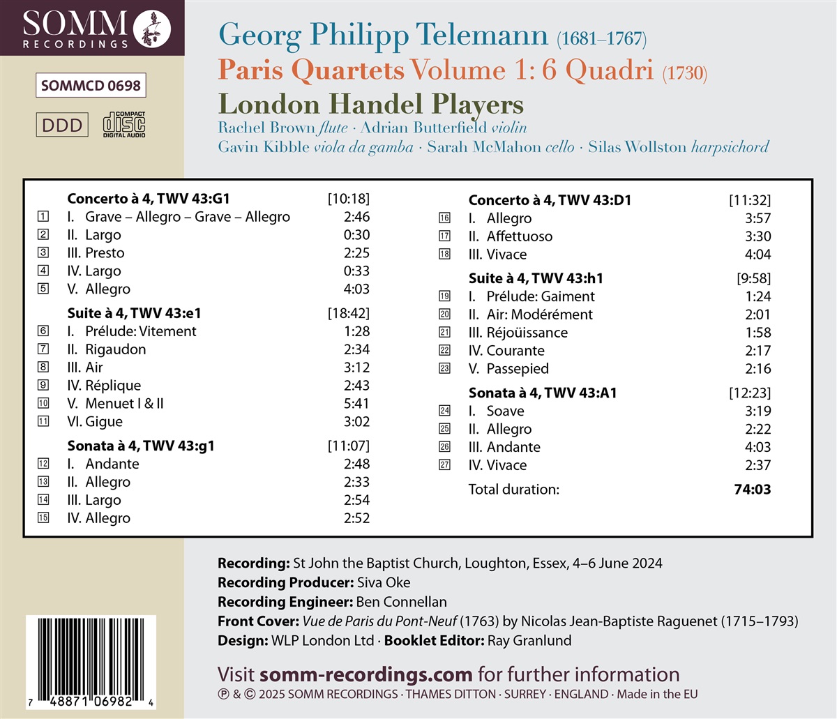 Georg Philipp Telemann (1681–1767) war – um ihn mit zeitgenössischen Worten zu charakterisieren – ein Workaholic, dem wir über 3000 Werke verdanken. Band 1 der Pariser Quartette präsentiert: „6 Quadri“, eingespielt von den führenden Spezialisten für historische Instrumente: The London Handel Player. Auf dem Höhepunkt seiner phänomenalen Produktivität hatte Telemann die Positionen des Kantors an der Johanneum-Lateinschule in Hamburg, des Kapellmeisters der fünf größten Kirchen der Stadt und des Direktors der Hamburger Oper inne. Er war auch den Höfen in Eisenach und Bayreuth verpflichtet. Als ob das nicht genug wäre, begann er ein ehrgeiziges Projekt zur Selbstveröffentlichung seiner Werke. Dazu gehörten die hier vorliegenden Quartette für Violine, Flöte, Viola da Gamba oder Cello und Continuo, nämlich zwei italienische Konzerte, zwei Sonaten im deutschen Stil und zwei Balletti oder Suiten französischer Tänze. Der erste Satz von Quartetten, oder Quadri, wurde in Hamburg veröffentlicht – sicherlich bis 1730, auch wenn das genaue Datum unbekannt ist – und war so beliebt, dass er 1736 in Paris von Le Clerc ohne Telemanns Erlaubnis neu aufgelegt wurde. Das Ensemble der London Handel Players ist flexibel in der Besetzung und besteht hauptsächlich aus Streichern, Flöte/Blockflöte und Cembalo. Die Musiker, die auf dem ersten Album der „Paris Quartets“ von Telemann zu hören sind, sind Rachel Brown (Flöte), Adrian Butterfield (Violine), Gavin Kibble (Viola da Gamba), Sarah McMahon (Cello) und Silas Wollston (Cembalo).