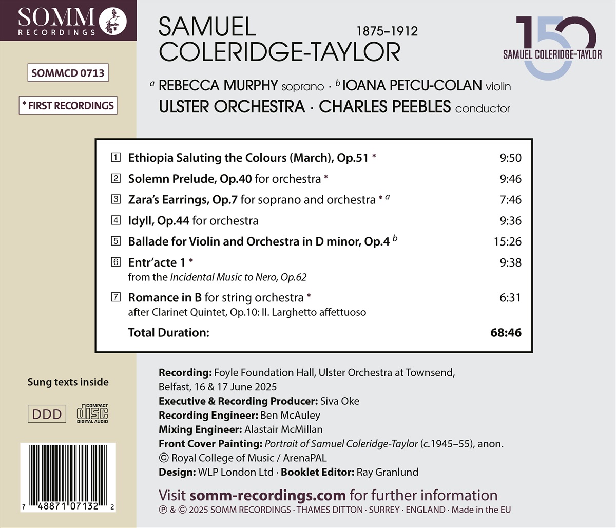 Dieses Album feiert den 150. Geburtstag von Samuel Coleridge-Taylor (1875–1912) mit einer vielfältigen Auswahl seiner Orchesterwerke, die sowohl seine afro-britische Herkunft als auch sein musikalisches Umfeld widerspiegeln, zu dem Gustav Holst und Vaughan Williams gehörten. Besonders hervorzuheben ist, dass fünf der sieben hier vorgestellten Werke Erstaufnahmen sind. Es spielt das Ulster Orchestra unter der Leitung von Charles Peebles, dessen Erstaufnahmen der Klavierkonzerte von Dora Bright und Ruth Gipps vielfach gelobt wurden. Es zeigte sich früh, dass Coleridge-Taylor über ein außergewöhnliches Talent verfügte, und er schuf ein bemerkenswertes Werk, bevor er im Alter von 37 Jahren viel zu früh verstarb. Sein erstes Werk für Gesang und Orchester, „Zara’s Earrings“, komponierte er im Alter von nur 19 Jahren, ebenso wie „The Ballade”. Als Coleridge-Taylor während seines Studiums am Royal College of Music Johannes Brahms' „Klarinettenquintett“ hörte, wurde er dazu angeregt, sein eigenes zu komponieren. „The Romance for string orchestra“ ist eine Bearbeitung des introspektiven Larghetto affettuoso-Satzes des Quintetts. „Solemn Prelude“, geschrieben für das Worcester Three Choirs Festival von 1899, ist ein Werk von elegischem Pathos, das seit seiner Wiederaufführung im Jahr 2021 von einigen der renommiertesten Orchestern der Welt gespielt wurde. Coleridge-Taylors „Idyll“, ein Auftragswerk für das Gloucester Three Choirs Festival im Jahr 1901, war eine Überarbeitung des „Lament“ aus seiner Sinfonie in a-Moll. „Ethiopia Saluting the Colours“ aus dem Jahr 1902 ist ein überschwängliches Werk für Orchester und Orgel. Beerbohm Tree beauftragte Coleridge-Taylor 1906 mit der Komposition der Begleitmusik für Stephen Phillips Theaterstück „Nero“, und die Möglichkeit, seine Musik jeden Abend zu hören, war für Coleridge-Taylor eine besondere Freude. Diese Jubiläumssammlung enthält das erste „Entr’acte“, das auch bei den Proms 1907 unter Henry Wood zu hören war.