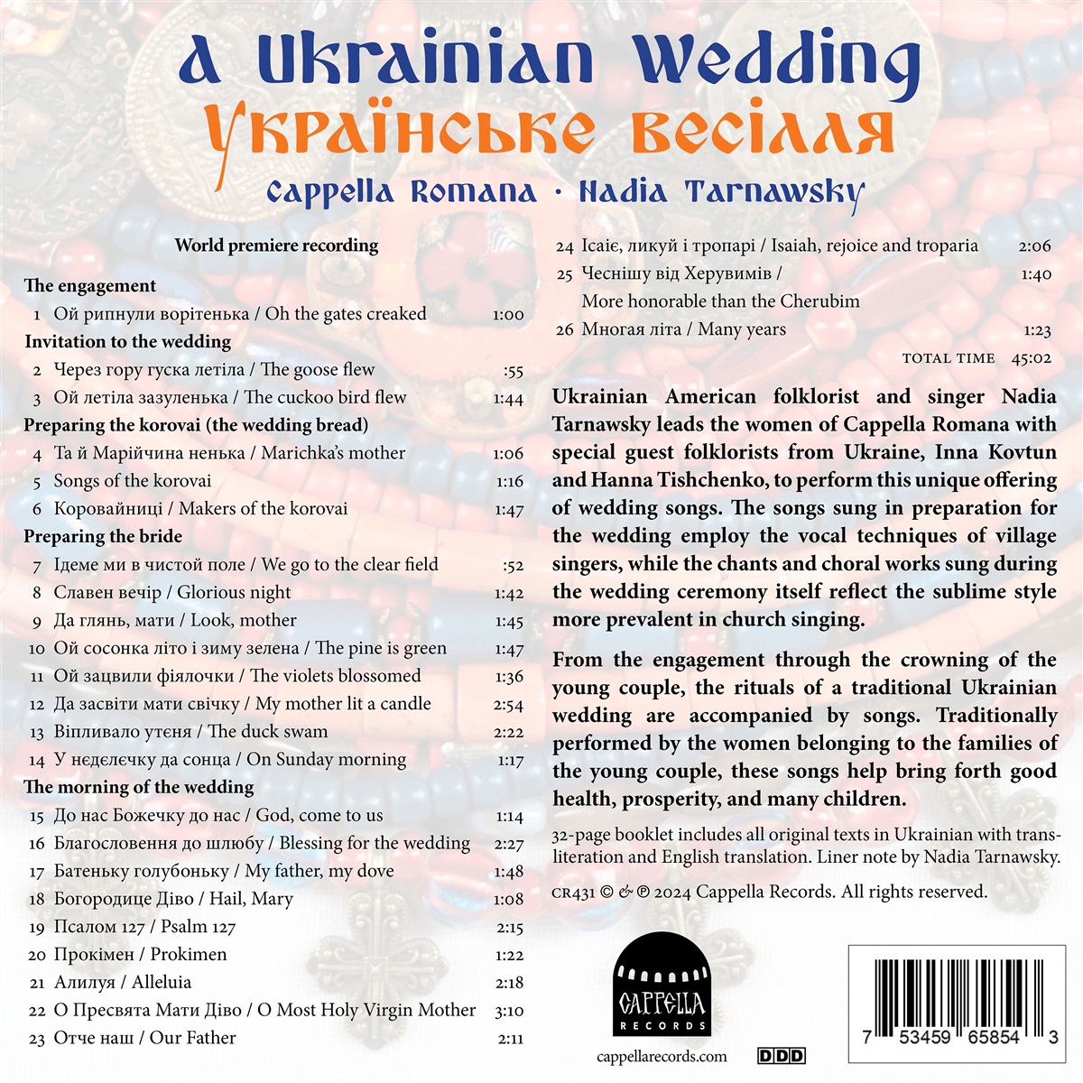 Die ukrainisch-amerikanische Musikwissenschaftlerin und Sängerin Nadia Tarnawsky leitet die Frauen der Cappella Romana mit den ukrainischen Gast-Sängerinnen Inna Kovtun und Hanna Tishchenko, um dieses außergewöhnliche Programm mit ukrainischen Hochzeitsliedern zu GEhör zu bringen. Bei den Liedern, die zur Vorbereitung der Hochzeit gesungen werden, kommen Gesangstechniken von dörflichen Sängerinnen zum Einsatz, während die Gesänge und Chorwerke, die während der Hochzeitszeremonie selbst gesungen werden, den erhabenen Stil widerspiegeln, der im Kirchengesang vorherrscht. Von der Verlobung bis zur Vermählung des jungen Paares werden die Rituale einer traditionellen ukrainischen Hochzeit von Liedern begleitet. Die Lieder, die traditionell von den Frauen der Familien des jungen Paares gesungen werden, sollen Gesundheit, Wohlstand und viele Kinder hervorbringen. Nadia Tarnawsky hat die Lieder vor dem russischen Einmarsch in die Ukraine im Jahr 2022 von oft über 80-jährigen Frauen gesammelt.