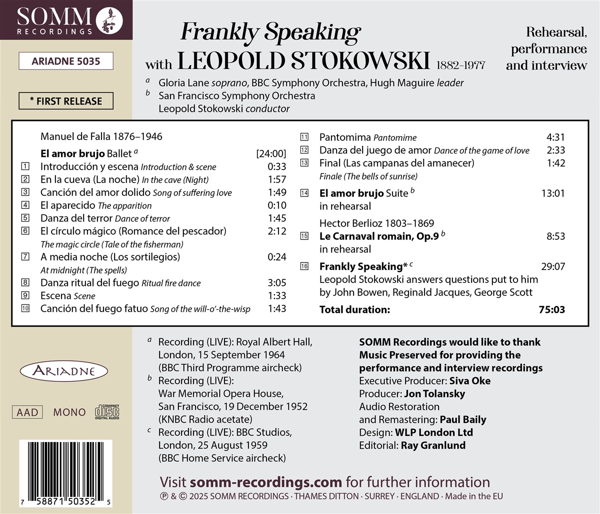 SOMM Recordings veröffentlicht mit großer Freude „Frankly Speaking with Leopold Stokowski“, das seltene Einblicke in das Leben des legendären Maestros durch Live-Aufnahmen einer Aufführung, einer Probe und eines Interviews gewährt. Das Album präsentiert Stokowski, der das BBC Symphony Orchestra und die Sopranistin Gloria Lane bei einer Aufführung von „El amor brujo“ von Manuel de Falla am 15. September 1964 in der Royal Albert Hall dirigiert, sowie eine Probe eben dieses Werks und von Hector Berlioz' Ouvertüre „Le carnaval romain“ mit dem San Francisco Symphony Orchestra im War Memorial Opera House am 19. Dezember 1952. Es enthält auch ein „Frankly Speaking“-Interview des BBC Home Service mit Stokowski, in dem er Fragen beantwortet, die ihm John Bowen, Reginald Jacques und George Scott am 25. August 1959 in den BBC-Studios in London gestellt haben.