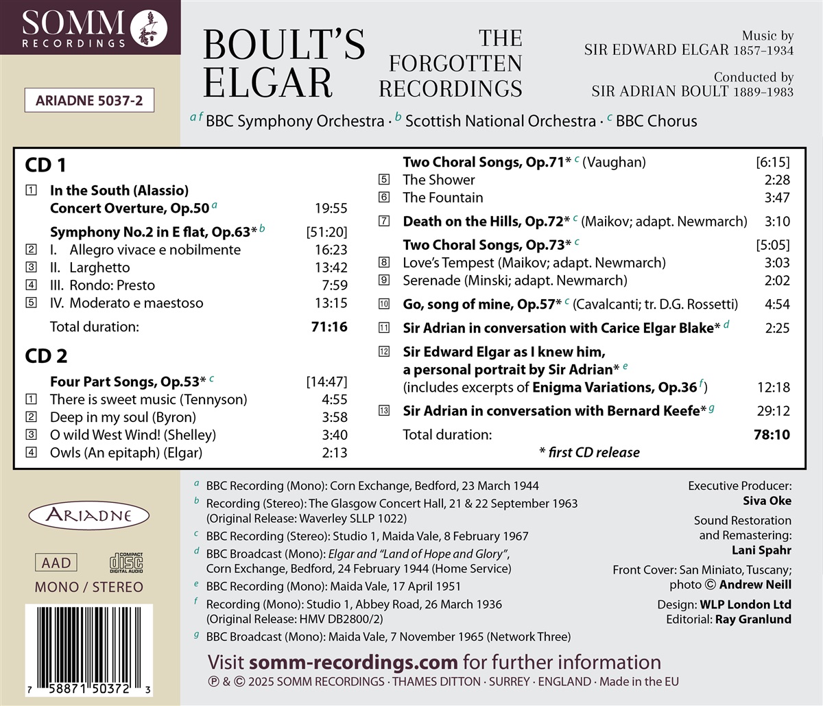 „Boult's Elgar – The Forgotten Recordings“, hebt Sir Adrian Boults lebenslanges Engagement für die Musik von Edward Elgar hervor. Der Oboist und Musikwissenschaftler Lani Spahr hat diese verlorenen Schätze durch seine hervorragende Arbeit bei der Klangrestaurierung wieder zum Leben erweckt. Boult dirigierte die Konzertouvertüre erstmalig „In the South“ 1918, kurz vor Ende des 1. Weltkriegs und 1944, mitten im 2. Weltkrieg ein zweites Mal. Das Radiokonzert mit dem BBC Orchestra ist hier zu hören.