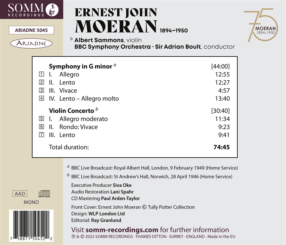 Das bewegte Leben des englischen Komponisten Ernest John Moeran (1894–1950) endete vor 75 Jahren, als er in Kenmare in Irland wegen einer Hirnblutung ins Wasser stürzte. Zu Ehren seines Lebens und Werks enthält diese Veröffentlichung Aufnahmen, die Lionel Hill, Autor von „Lonely Waters – the diary of a friendship with E J Moeran”, privat aufnahm. Diese Gedenkveröffentlichung mit einer hervorragenden Audio-Restaurierung von Lani Spahr enthält Moerans Sinfonie in g-Moll unter der Leitung von Sir Adrian Boult und sein Violinkonzert mit dem unvergleichlichen Albert Sammons als Solisten. Zusätzlich ist Moerans Cellokonzert als Download erhältlich, mit dem BBC Symphony Orchestra unter der Leitung von Adrian Boult. E. J. Moeran wurde als Sohn eines irischen protestantischen Priesters und einer aus Norfolk stammenden Mutter geboren, und die Dualität seiner Nationalität findet Ausdruck in seiner Musik. Seine Sinfonie in g-Moll entstand teilweise in der irischen Grafschaft Kerry, aber das Material für den zweiten Satz wurde in den Sanddünen und Sümpfen von East Norfolk konzipiert. Am 9. Februar 1949 besuchten Moeran und sein Freund Lionel Hill eine Aufführung der Sinfonie in der Royal Albert Hall, bei der Adrian Boult das BBC Symphony Orchestra dirigierte. Diese Aufführung ist auf diesem Album zu hören. Das andere Stück – ebenfalls vom irischen Wetter inspieriert – ist das Violinkonzert, das für eine BBC Home Service-Sendung in Norfolk am 28. April 1946 aufgenommen wurde, und es war Albert Sammons‘ letzter öffentlicher Konzertauftritt und wahrscheinlich seine einzige live-Aufnahme. Im Dezember 1943 schrieb Moeran für seine Verlobte, die irische Cellistin Peers Coetmore, ein Werk von bemerkenswerter Schönheit, das besonders durch die typisch irische Melodie in Erinnerung bleibt, mit der der langsame Satz beginnt. Nach der Uraufführung in Dublin spielte Coetmore das Werk im April 1946 bei der ersten Aufführung in London.