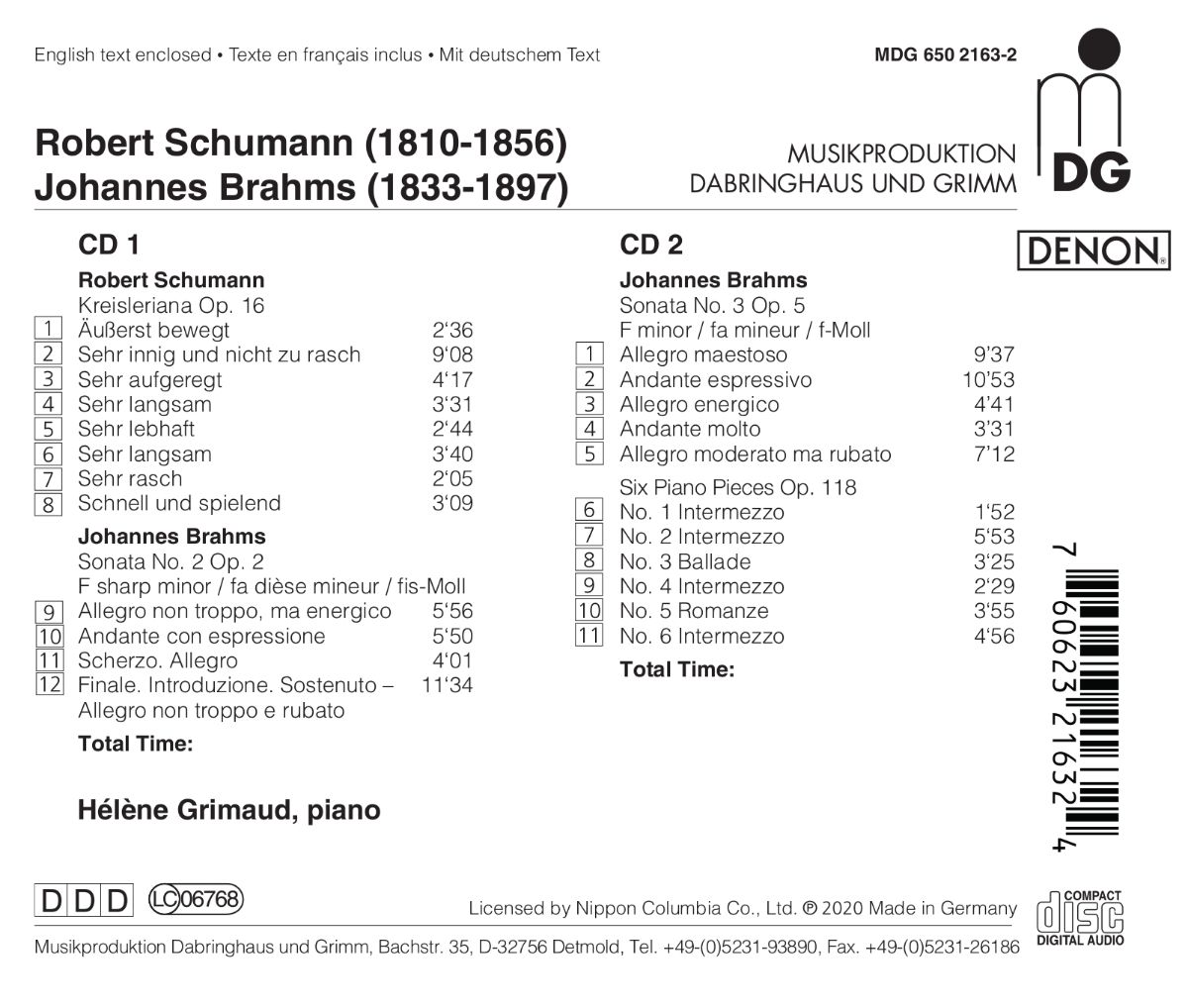 In einem Doppelalbum präsentiert MDG als Neuausgabe Hélène Grimauds frühe Aufnahmen für das DENON-Label aus den Jahren 1985 bis 1992, darunter das große romantische Repertoire von Brahms und Schumann. Sie zeigen eine eigenwillige, früh vollendete Künstlerpersönlichkeit, für die die Schublade „Wunderkind“ ganz offensichtlich zu klein gewählt ist.