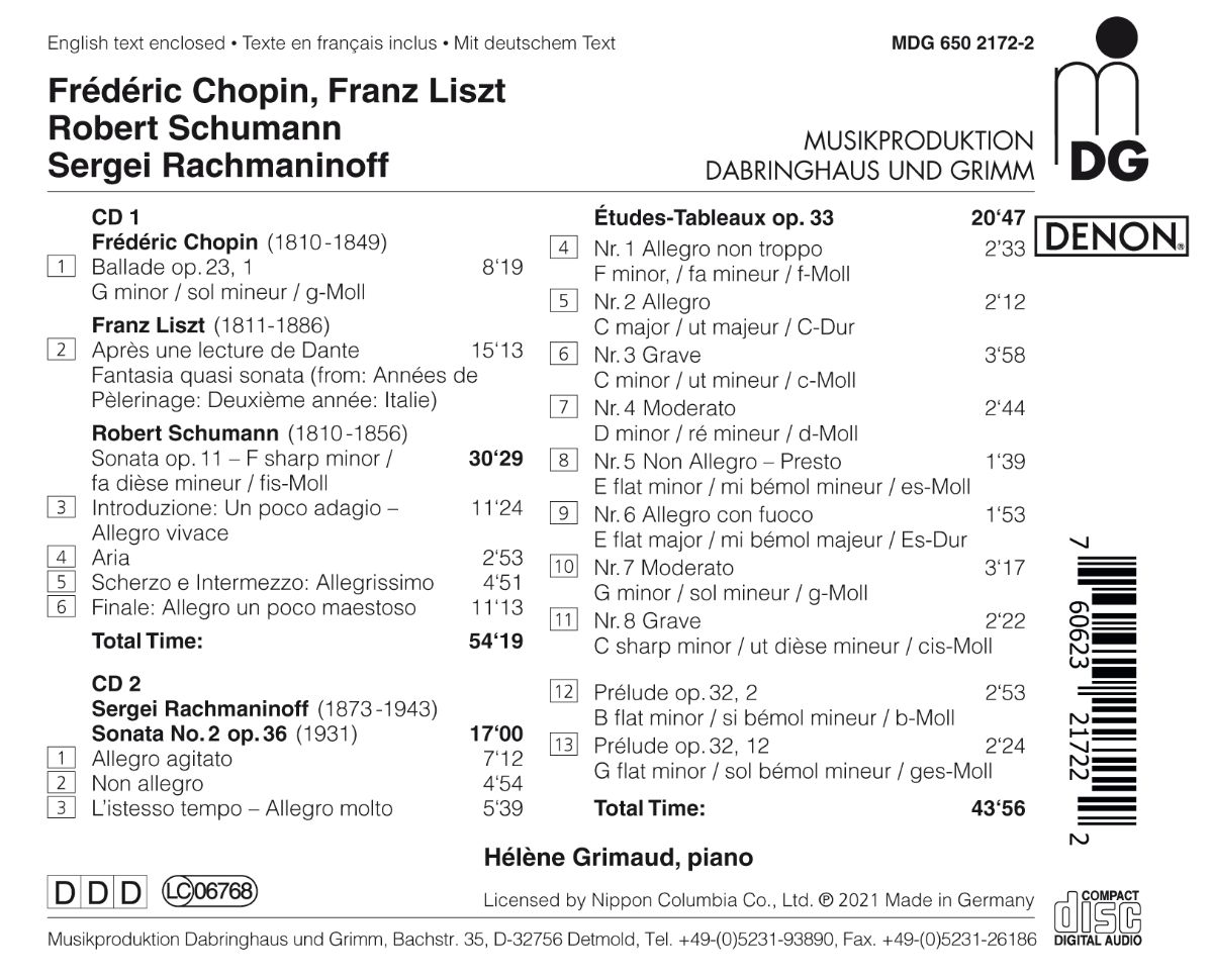 Gerade einmal 15 Jahre alt war Hélène Grimaud, als sie für das legendäre audiophile Label Denon Rachmaninows 2. Klaviersonate und die „Études-Tableaux“ einspielte. Der Begriff „Wunderkind“ erfuhr bei der Pianistin eine neue Deutung, denn es handelte sich nicht um eine auf Geschwindigkeit und Show-Effekte gedrillte Klavier-Maschine, sondern um eine erstaunlich reife Künstlerpersönlichkeit, die im romantischen Repertoire völlig symbiotisch aufging. Mit dieser dritten Folge der Wiederveröffentlichungen sind alle frühen Denon-Aufnahmen (1982-1992) dieser einzigartigen Künstlerin in bester Tonqualität wieder verfügbar.