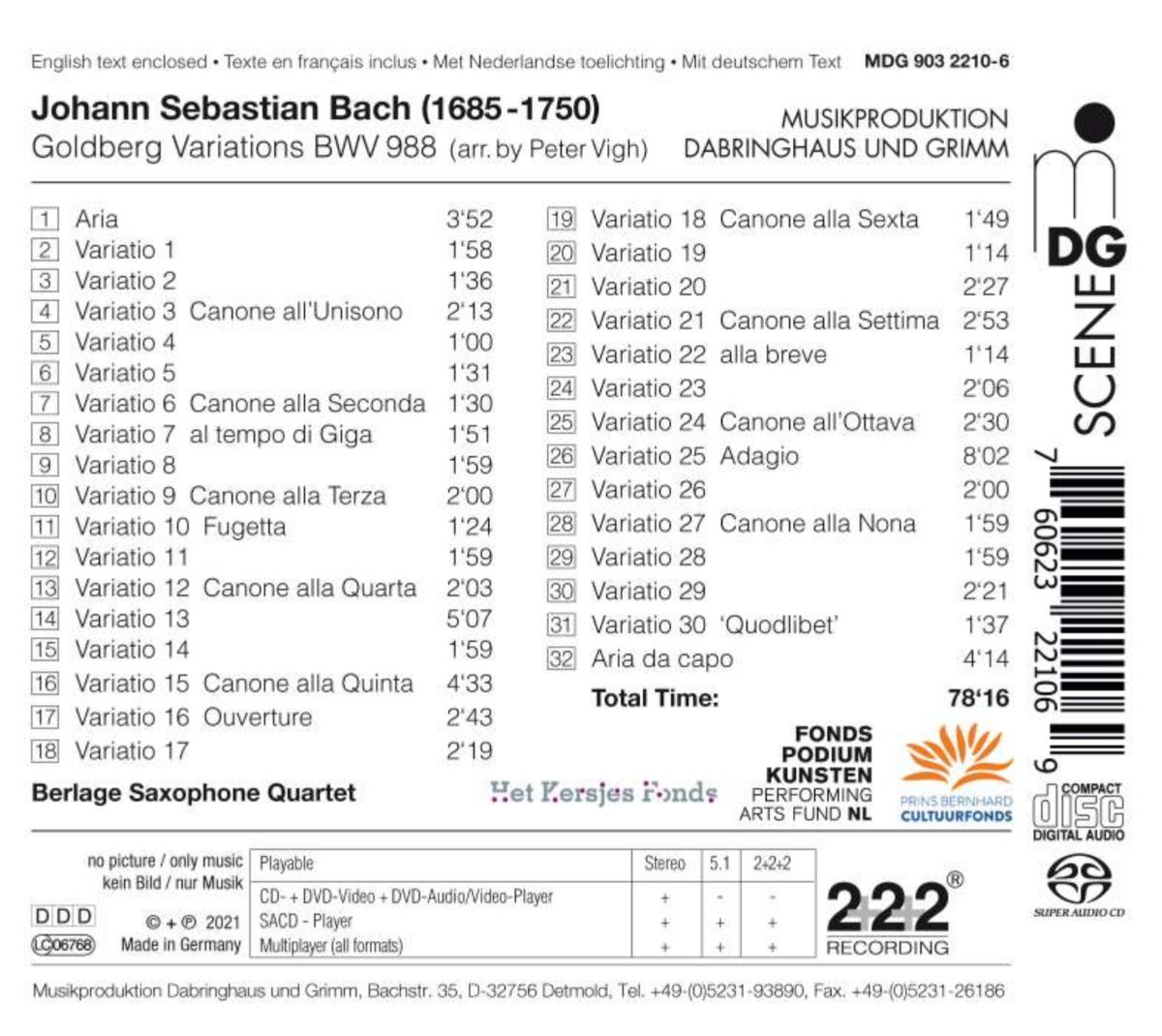 Bach: Goldbergvariationen arr. für Saxophonquartett