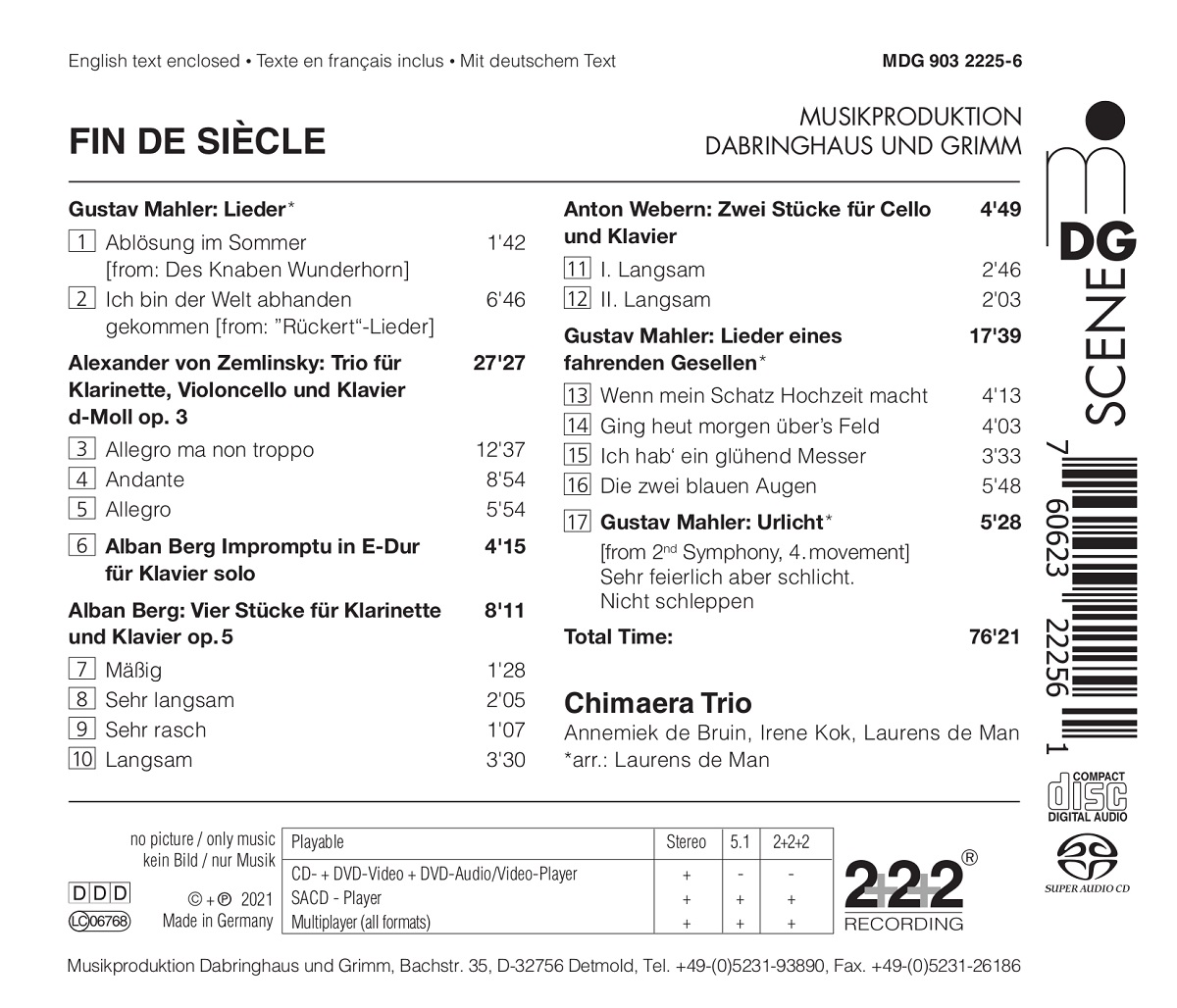 Mit Musik des Fin de Siècle debütiert das niederländische Chimaera Trio – Annemiek de Bruin, Klarinette, Irene Kok, Cello und Laurens de Man, Klavier – bei der audiophilen Klangschmiede von MDG. Um das geradezu sinfonische Klarinettentrio von Alexander von Zemlinsky herum platzieren die Musiker Werke von Alban Berg und Anton Webern. Dreh- und Angelpunkt des Programms ist Gustav Mahler, dessen Liedtranskriptionen in dieser Zusammenstellung Raum für allerhand Beziehungs- und Ästhetik-Assoziationen bieten.