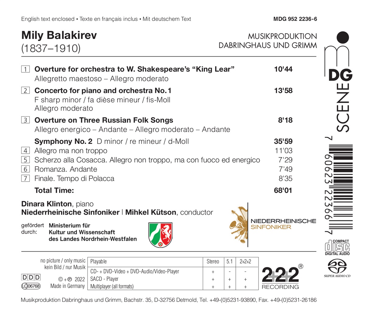 Aus den Konzertsälen ist die Musik von Mily Balakirew heute weitgehend verschwunden. Da kommt die taufrische Neueinspielung der Niederrheinischen Symphoniker unter der Leitung von Chefdirigent Mihkel Kütson gerade recht: Das selten gespielte, unvollendete 1. Klavierkonzert mit der ukrainischen Pianistin Dinara Klinton als Solistin, dazu die 2. Sinfonie und zwei überaus originelle Ouvertüren belegen den besonderen Rang, den Balakirew nicht zuletzt als spiritus rector des sogenannten „Mächtigen Häufleins“ in der Musikgeschichte einnahm.