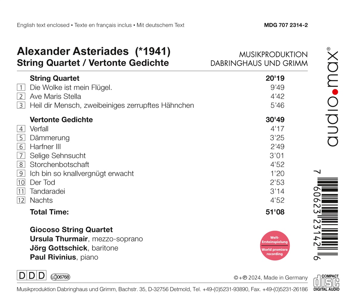 Asteriades: Streichquartett & Vertonte Gedichte