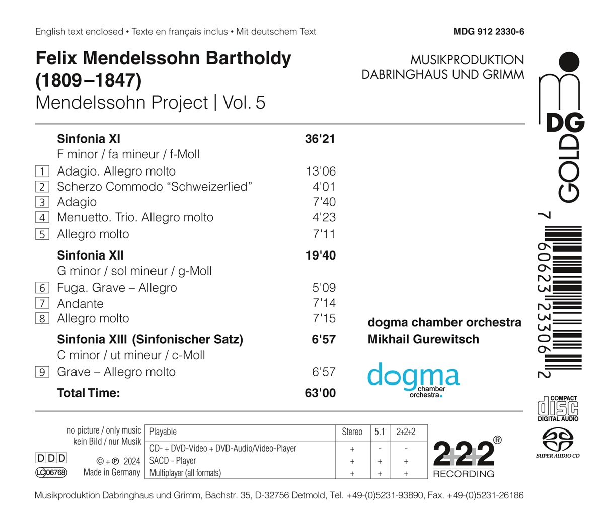 Fulminanter Abschluss eines ambitionierten Projektes: Mit den Sinfonien 11 bis 13 beendet das Dogma Chamber Orchestra seine Gesamtaufnahme sämtlicher Werke mit Streichorchester von Felix Mendelssohn Bartholdy. Aus dem überaus talentierten und neugierigen Schüler ist inzwischen ein gereifter Künstler geworden – mit gerade einmal 14 Jahren. Das zeigt sich nicht zuletzt an der selbstbewussten Handhabung der musikalischen Form: Die umfangreiche Sinfonie Nr. 11 umfasst fünf Sätze; zwischen den schwungvollen Kopfsatz mit intensiver Einleitung und das traumhaft-schöne Adagio schiebt Mendelssohn ein gemächliches Scherzo, das als „Schweizerlied“ noch mit einer besonderen Überraschung aufwartet. Sehr viel knapper ist die Sinfonie Nr. 12 gehalten. Zwei der drei Sätze weisen ausgedehnte fugierte Passagen auf - man darf vermuten, dass der Unterricht bei Carl Friedrich Zelter hier seine Spuren hinterlassen hat. Die zwei Bratschenstimmen verleihen dem Adagio – wie so häufig bei Mendelssohns frühen Sinfonien – eine ganz eigene, zauberhafte Klangfarbe. Mit dem Kopfsatz einer 13. Sinfonie endet Mendelssohns Oeuvre für Streichorchester, und der hat es in sich: Die rasante Doppelfuge beweist die kontrapunktische Meisterschaft des Jungen, während das rauschhafte Unisono bereits die aufziehende Romantik ahnen lässt. Das Dogma Chamber Orchestra präsentiert die Jugendwerke eines ganz Großen mit Esprit und Verve, mit Klangsinn und Kraft – schöner kann man eine Gesamtaufnahme nicht abschließen.