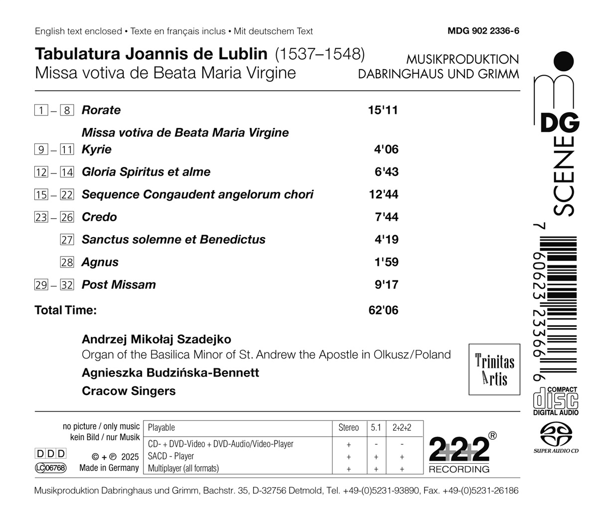 Andrzej Szadejko ist ein nimmermüde Forscher, Organist und Ensembleleiter, der sich bisher auf die polnische Musik des 17. und 18. Jahrhunderts konzentrierte. Auf diesem Album geht er noch ein weiteres Jahrhundert zurück: Orgelmusik aus der Tabulatur des Johannes von Lublin, einer der umfangreichsten Sammlungen von Instrumentalmusik aus dem 16. Jahrhundert, stellt Szadejko in den passenden liturgischen Kontext, den die Cracow Singers mit gregorianischem Choral und frühen mehrstimmigen Stücken eindrucksvoll zelebrieren.