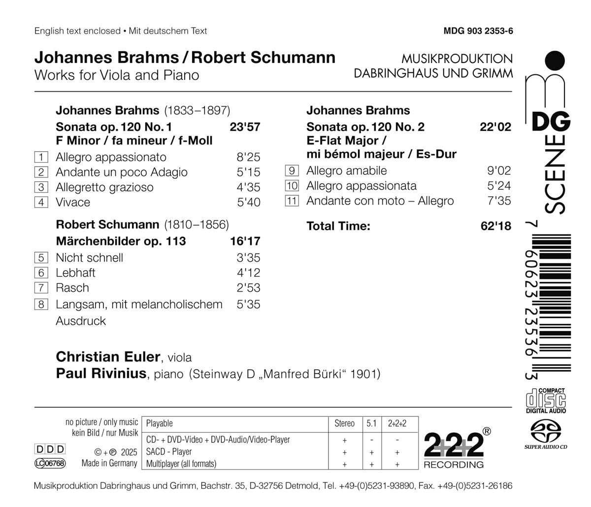 Johannes Brahms hätte seine helle Freude gehabt: Zeitlebens haderte er mit der Bratschenversion seiner Klarinettensonaten, da die vermeintlich notwendige Adaption an das Streichinstrument zu unschönen Eingriffen in die musikalische Struktur führte. Bratschist Christian Euler zeigt, dass es auch anders geht, und präsentiert gemeinsam mit Klavierpartner Paul Rivinius seine Version der beiden Meisterwerke, die mit nahezu unveränderter Stimmführung ein ebenso originales wie originelles Musikerlebnis garantiert. Brahms' letzte Sonaten müssen dem Komponisten eine Herzensangelegenheit gewesen sein, denn eigentlich hatte er schon aufgehört zu komponieren und griff nur wegen des betörenden Klarinettenspiels von Richard Mühlfeld wieder zum Bleistift. Mit der Erfahrung eines langen Musikerlebens entstanden diese zauberhaften Kompositionen, die das Fin de Siècle bereits vorausahnen lassen. Robert Schumanns „Märchenbilder“, ein knappes halbes Jahrhundert zuvor niedergeschrieben und eine der wenigen Originalkompositionen für Viola und Klavier, bilden dazu den größtmöglichen Kontrast: Hier die fantasiebeflügelnden Charakterstücke, dort die strenge Sonate, hier der romantische Überschwang, dort die klassizistische Form in höchster Vollendung. Dass beides höchste spieltechnische Anforderungen stellt, ist Eulers Musizieren nicht anzumerken. Seien es die gefürchteten Doppelgriffe im zweiten „Märchenbild“, oder die quirligen Klarinettengirlanden in den Sonaten: Stets findet er genau den richtigen Tonfall, dabei mustergültig unterstützt von Paul Rivinius, der mit uneitler Präsenz zu einem beglückenden Hörerlebnis beiträgt.