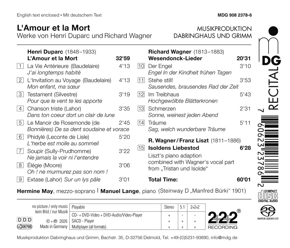 Liebe und Tod – das ewige Thema aller Kunst, musikalisch zu höchster Vollendung gebracht in Wagners „Tristan“. Hermine May und Manuel Lange widmen sich „Isoldens Liebestod“ – natürlich als Höhe- und Schlusspunkt eines fulminanten Programms, das über die Wesendonck-Lieder und neun Mélodies des glühenden Wagner-Enthusiasten Henri Duparc mit existentieller Wucht auf die tödliche Ekstase der Isolde zuläuft. Auch wenn die zyklische Anlage von Duparc vielleicht gar nicht beabsichtigt war: Die Auswahl der Mélodies, die May und Lange hier präsentieren, durchmessen alle Stationen der Liebe im „Tristan“, von der verhaltenen Sehnsucht über die lustvolle, freilich verbotene Erfüllung bis zum dramatischen Ende. … Lustvoll und verboten ist auch Wagners Beziehung zu Mathilde Wesendonck, deren Gatten der Komponist sein bequemes Zürcher Asyl verdankt. Mit der Vertonung der Gedichte seiner Geliebten nähert sich Wagner dem „Tristan“-Stoff an; die fieberhafte Atmosphäre ist besonders in „Im Treibhaus“ und „Träume“ geradezu mit Händen zu greifen. Mays „Isolde“ glüht vor Leidenschaft und Hingabe, noch gesteigert durch die Lisztsche Klavierfassung, die Lange anstelle eines gewöhnlichen Klavierauszugs spielt. Gerade die Gegenüberstellung mit Duparcs Mélodies, die in ihren duftigen Harmonien bereits weit über Wagner hinausreichen, sorgt für so manchen Gänsehautmoment.