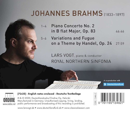 Das zweite Album in Lars Vogts Brahms-Konzertreihe mit der Royal Northern Sinfonia enthält das 2. Klavierkonzert des Hamburger Komponisten. Erneut ist das Konzert mit einem Soloklavier-Werk kombiniert, dieses Mal mit den „Variationen und Fuge über ein Thema von Händel“, die Brahms Clara Schumann gewidmet hat.