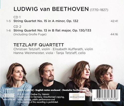 Das neue Album des angesehenen Tetzlaff-Quartetts mit zwei späten Streichquartetten Beethovens ist eine angemessene Würdigung anlässlich des diesjährigen, vielbeschworenen Beethoven-Jahres. Die ausgewählten monumentalen Werke – das Streichquartett Nr. 15 op. 132 in a-Moll von 1825 und das Streichquartett Nr. 13 op. 130 in B-Dur von 1826 inklusive des ursprünglichen Finales, der Großen Fuge op. 133 in B-Dur – gehören zu den größten Errungenschaften in der Geschichte der westlichen Kunstmusik. Sie wurden von einem Komponisten geschrieben, der den Kontakt zur Welt bereits weitgehend verloren hatte: Vollendung und Mysterium zugleich.