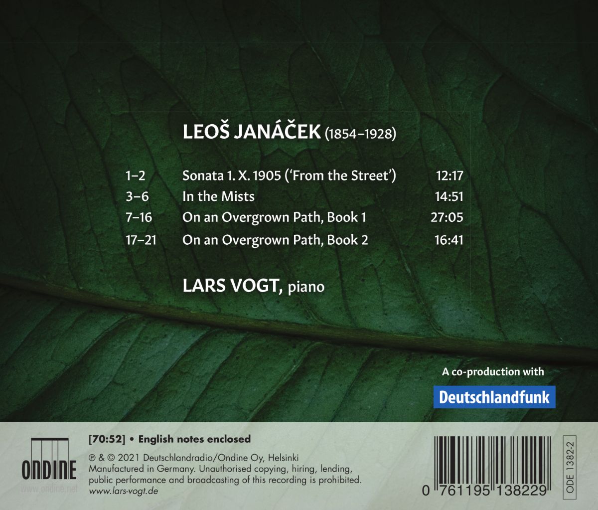 Das neue Soloalbum des Pianisten Lars Vogt ist den Klavierwerken von Leoš Janá?ek gewidmet, einer der eigenständigsten Persönlichkeiten unter den Komponisten des 20. Jahrhunderts. Dieses Album enthält drei der bekanntesten und umfangreichsten Solo-Klavierwerke des Komponisten: Die Sonate 1. X. 1905 „Von der Straße“, „Im Nebel“ und die beiden Bücher „Auf verwachsenem Pfade“. Diesen Werken ist gemein, dass sie von tiefer Melancholie und Leidenschaft geprägt sind. Sie manifestieren die innere Gefühlswelt des Komponisten durch eine musikalische Sprache, die auch über einhundert Jahre nach Entstehung zeitlos modern wirkt.