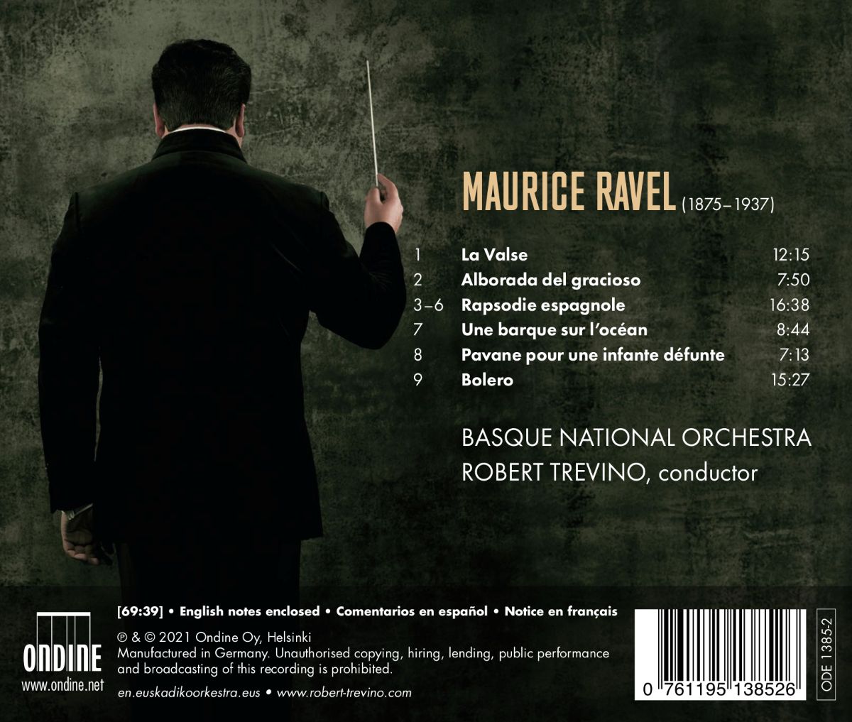 Die zweite Albumveröffentlichung des Dirigenten Robert Trevino auf Ondine enthält sechs Orchesterstücke von Maurice Ravel, dem wohl berühmtesten Komponisten mit baskischen Wurzeln, gespielt vom Baskischen Nationalorchester. Geboren in einer Kleinstadt im französischen Baskenland, verbrachte Ravel den Großteil seines Lebens in Paris. Er war jedoch sehr stolz auf seine baskische Herkunft, da er von Kindheit an tief in die Kultur seiner Mutter eingetaucht war. Viele Elemente der baskischen Volksmusik finden sich in seinen Kompositionen wieder. Endlich kann man nun Ravels Orchestermusik von baskischen Musikern interpretiert hören. Die Aufnahmen einiger seiner bekanntesten Werke werfen ein neues Licht auf die baskischen Einflüsse in Ravels Musik.