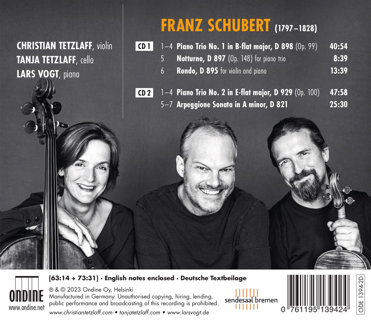 Dieses Album des Pianisten Lars Vogt, des Geigers Christian Tetzlaff und der Cellistin Tanja Tetzlaff enthält einige der größten Kammermusikwerke Franz Schuberts: seine beiden nummerierten Klaviertrios und das Notturno D 897, das Rondo D 885 für Violine und Klavier und die Arpeggione-Sonate. Das Album ist ein beeindruckendes Zeugnis von Lars Vogts herausragender Intensität beim Spiel, die er mit seinen langjährigen Kammermusikpartnern und Freunden Christian Tetzlaff und Tanja Tetzlaff entwickelte. Vogt schrieb seinen Triopartnern zu den Aufnahmen: „Wenn ich nicht mehr lange sein sollte, ist das ein würdiger Abschied. Ihr zwei seid der Wahnsinn. (…) Solcher Ausdruck. Solche Fragilität, solche Liebe.“