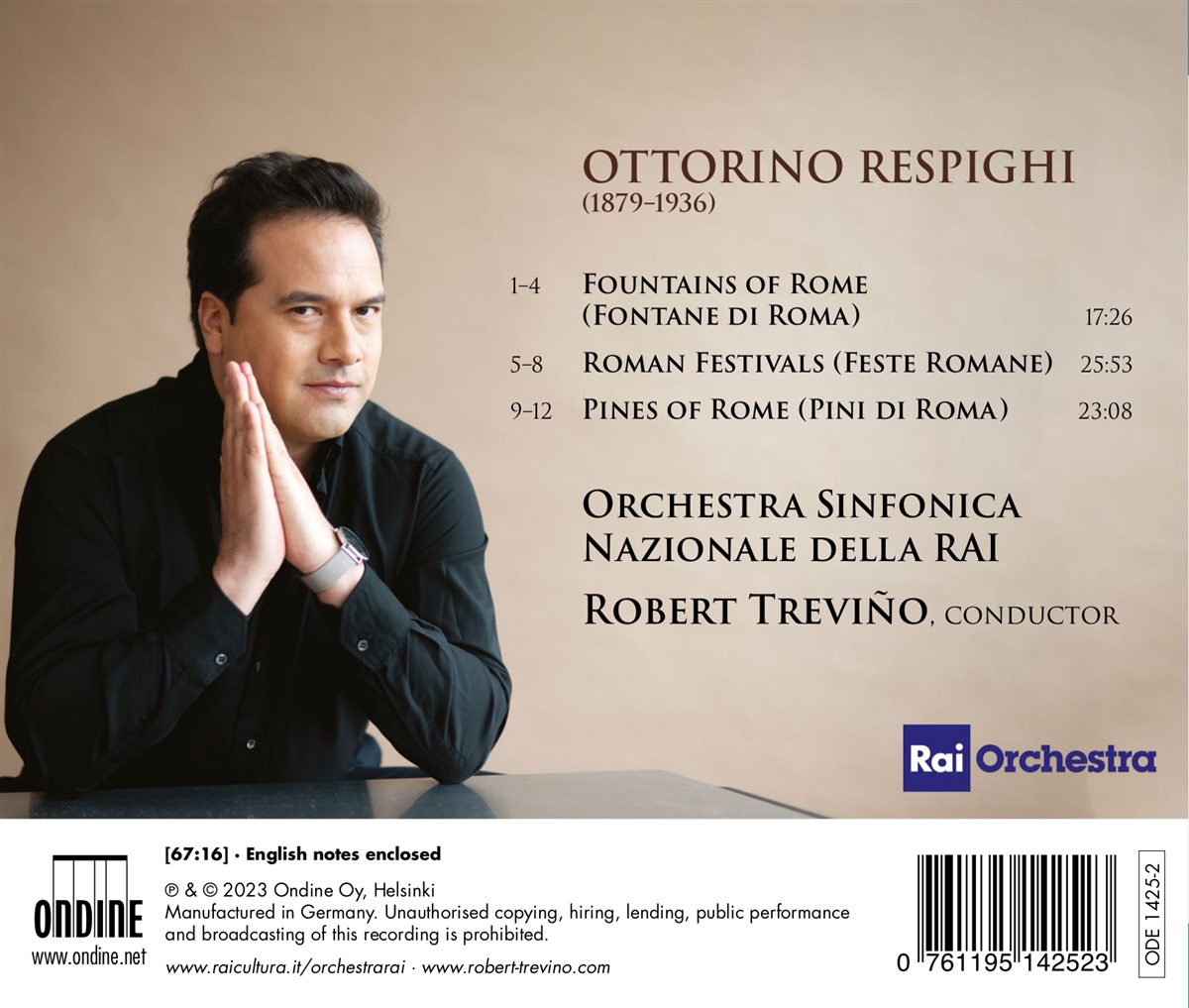 Nach Aufnahmen mit Werken verschiedenster Komponisten sowie dem preisgekrönten „Americascapes“-Projekt, wendet sich der nimmermüde US-amerikanische Dirigent Robert Trevino den drei berühmtesten sinfonischen Dichtungen des italienischen Komponisten Ottorino Respighi zu. Zusammen mit dem Orchestra Nazionale Sinfonica della RAI präsentiert Trevino eine funkelnde Gesamtaufnahme der berühmten „Römischen Trilogie“: Es sind aufregende orchestrale Meisterwerke, die in den triumphalen „Pini di Roma“ gipfeln, einem der meistaufgeführten Orchesterwerke des 20. Jahrhunderts überhaupt.