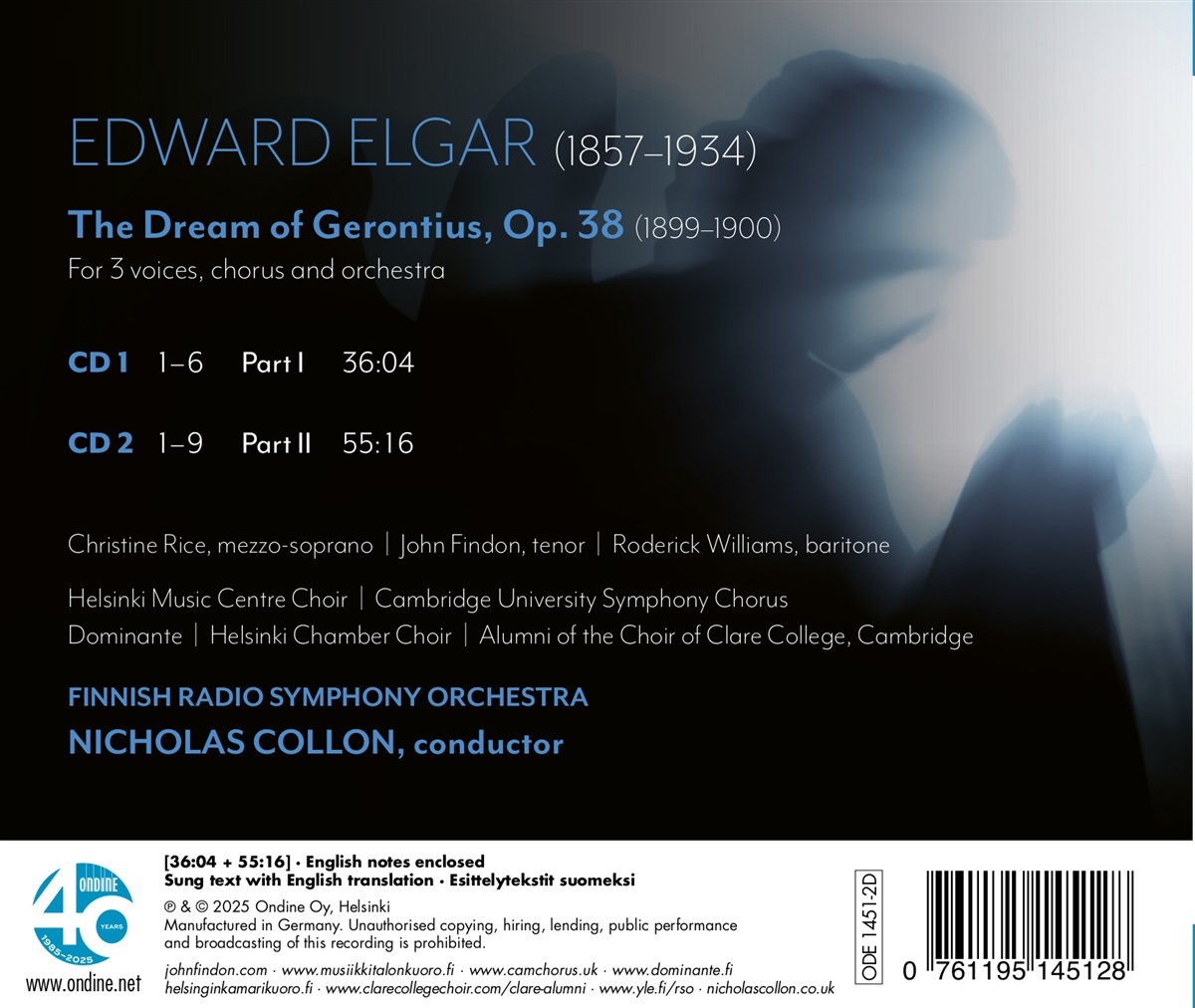 „Das ist das Beste von mir“, schrieb Edward Elgar im Jahr 1900 am Ende des Manuskripts von ‚The Dream of Gerontius‘. Diese beeindruckende und moderne neue Aufnahme von Elgars Opus magnum durch das Finnische Radio-Sinfonieorchester und den Dirigenten Nicholas Collon präsentiert neben der Mezzosopranistin Christine Rice, dem Tenor John Findon und dem Bariton Roderick Williams Sänger aus fünf verschiedenen Chören: Helsinki Music Centre Choir, Cambridge University Symphony Chorus, Dominante, Helsinki Chamber Choir und Ehemalige des Chors des Clare College Cambridge.