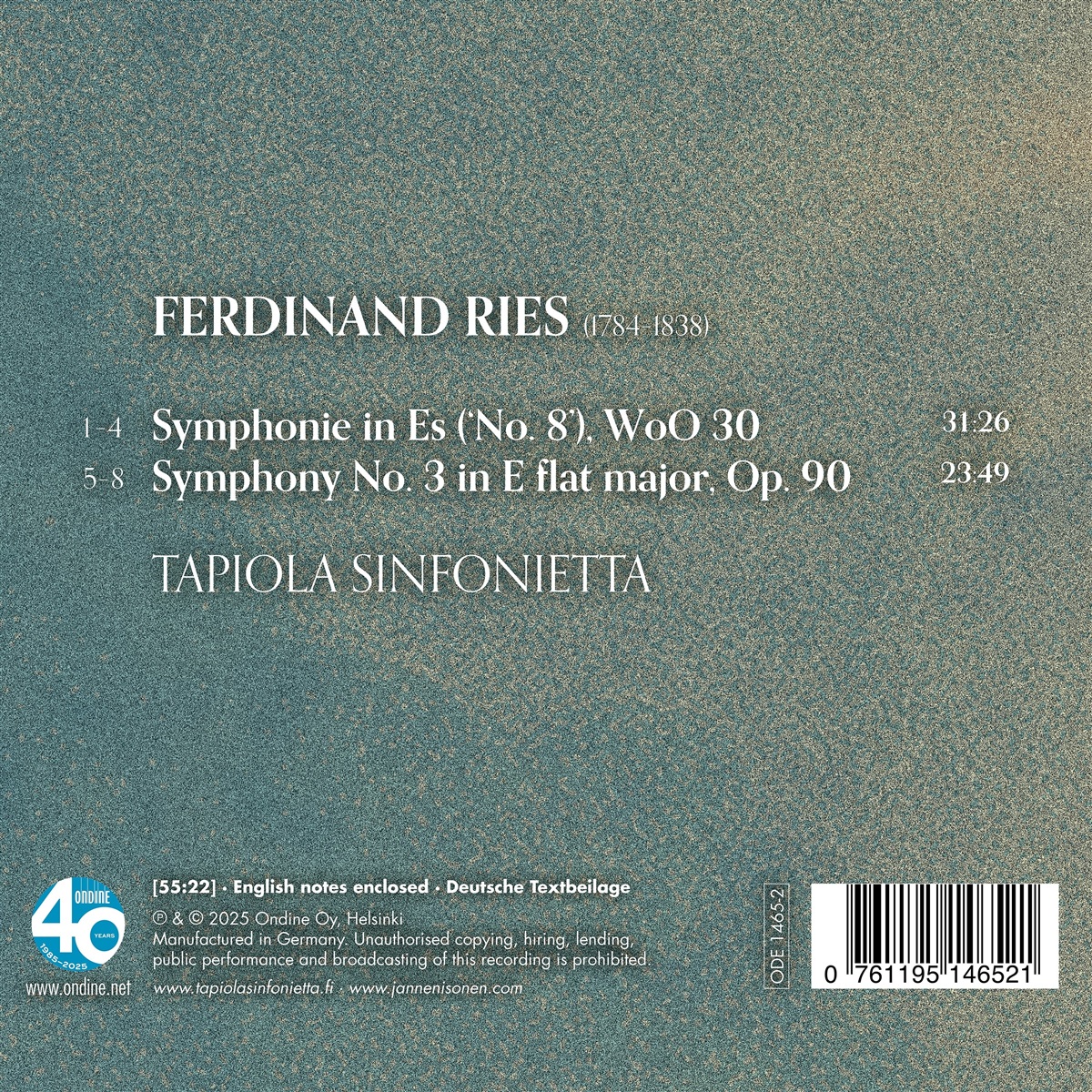 Dieser dritte Teil der vollständigen Sinfonien von Ferdinand Ries (1784–1838), enthält zwei wunderbare Werke, die auf dem Höhepunkt der Schaffenszeit des Komponisten entstanden sind, als der Einfluss seines Kompositionslehrers Beethoven in seine sinfonischen Musik abgenommen hatte. Die Sinfonie in Es-Dur, WoO 30, die manchmal auch als Sinfonie „Nr. 8“ bezeichnet wird, war chronologisch gesehen wahrscheinlich die fünfte Sinfonie Ries‘. Obwohl sie erfolgreich in London uraufgeführt wurde und den Einfluss von Rossinis populärem Stil erkennen lässt, fiel es Ries nach seiner Rückkehr nach Deutschland im Jahr 1824 schwer, einen Verleger für sein Werk zu finden. Es wurde erst in den 1830er Jahren veröffentlicht. Ries' Sinfonie Nr. 3, Op. 90 – ebenfalls in Es-Dur – wurde 1815 in London uraufgeführt. Obwohl weniger dramatisch als seine frühen Sinfonien, ist dieses Werk durch seine umfangreiche Solokomposition bemerkenswert, die am deutlichsten im dritten Satz, einem Menuett mit einer Solovioline und einer Soloklarinette, zum Ausdruck kommt. Die Tapiola Sinfonietta hat sich als Finnlands führendes Kammerorchester etabliert. Das Orchester ist für seine mutige Repertoireplanung bekannt und wird für seine nuancierten Darbietungen aus verschiedenen Epochen und Stilrichtungen gefeiert. Die Tapiola Sinfonietta tritt regelmäßig bei Musikfestivals in Finnland auf, und Tourneen ins Ausland haben ihren internationalen Ruf ebenso gestärkt wie ihre preisgekrönte Diskografie. Der Dirigent Janne Nisonen ist einer der vielseitigsten und gefragtesten Musiker Finnlands. Nisonen ist vor allem für seine stilvollen Darbietungen des klassischen und frühromantischen Repertoires bekannt und ein mutiger Verfechter zeitgenössischer Musik. Er hat unter anderem das Finnische Radio-Sinfonieorchester, das Helsinki Philharmonic Orchestra, das Turku Philharmonic Orchestra, Avanti! und das Tallinn Chamber Orchestra dirigiert.