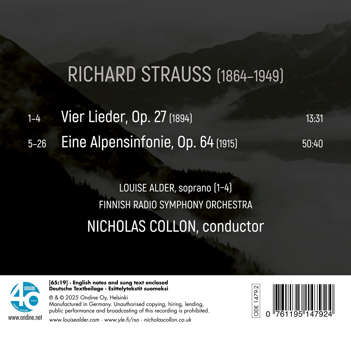 Das Finnische Radio-Sinfonieorchester und Dirigent Nicholas Collon setzen ihre Reihe mit einem neuen Album mit Orchesterwerken von Richard Strauss (1864–1949) fort. Es enthält Strauss' längstes und letztes großes Orchesterwerk, die „Alpensinfonie“, sowie „Vier Lieder“, Op. 27, gesungen von der Sopranistin Louise Alder. In Erinnerung an eine Bergwanderung aus seiner Kindheit vollendete Strauss im Februar 1915 die „Alpensinfonie“, die trotz ihres Titels die bildhaften und erzählerischen Eigenschaften aufweist, die das Genre ‚Tondichtung‘ ausmacht, ebenso wie die episodische Form und die thematische Metamorphose. Das Werk ist in zweiundzwanzig Abschnitte unterteilt, von denen einige sehr kurz sind. Die Orchestrierung erfordert mindestens 125 Musiker, das größte Ensemble in Strauss’ gesamtem Œuvre . Zu den ungewöhnlichen Instrumenten gehören Heckelphon, Wagner-Tuben, Orgel, Kuhglocken, Windmaschine, Donnermaschine und ein Bataillon von Hörnern, Trompeten und Posaunen hinter der Bühne. Strauss‘ aufwendig orchestrierte „Vier Lieder“, op. 27 sind besonders intim: Er schenkte sie seiner Frau zur Hochzeit. Die britische Sopranistin Louise Alder, eine der gefragtesten Künstlerinnen der Gegenwart ist gleichermaßen in den wichtigsten Opern-, Konzert- und Recital-Sälen der Welt zu Hause, darunter das Royal Opera House, die Wiener Staatsoper, die Bayerische Staatsoper, die Carnegie Hall und die Wigmore Hall, wo sie 2024 eine künstlerische Residenz innehatte. Die Mission des Finnischen Radio-Sinfonieorchesters ist es, die finnische Musikkultur zu fördern. Neben den großen Meisterwerken der Klassik und Romantik ist die neueste zeitgenössische Musik ein wichtiger Bestandteil seines Repertoires. Jedes Jahr findet die Uraufführung eine Reihe von Werken statt, die vom finnischen Rundfunk Yle in Auftrag gegeben wurden. Der britische Dirigent Nicholas Collon ist bekannt für seinen eleganten Dirigierstil, seinen musikalischen Intellekt und seine inspirierende Musik. Er trat 2021 seine Stelle als Chefdirigent des Finnischen Rundfunk-Sinfonieorchesters an, nachdem er zuvor Chefdirigent des Residentie Orkest in Den Haag gewesen war.