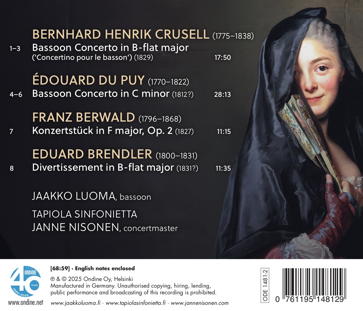 Dieses zweite Album mit Fagottkonzerten aus dem frühen 19. Jahrhundert von Jaakko Luoma und der Tapiola Sinfonietta enthält vier wunderbare Konzertjuwelen, die für Frans Carl Preumayr (1782–1853) geschrieben wurden, einen versierten und talentierten Fagottisten, der 1802 nach Stockholm zog. Die wohl bekanntesten Werke wurden von seinem finnischen Schwiegervater Bernhard Henrik Crusell und von Franz Berwald, dem berühmtesten Komponisten der Romantik in Schweden, komponiert. Das beeindruckende Fagottkonzert des in der Schweiz geborenen Édouard Du Puy ist nur sehr selten zu hören. Auch der in Deutschland geborene Komponist Eduard Brendler ist in der Musikgeschichte weitgehend in Vergessenheit geraten. Alle vier Werke sind kraftvolle, interessante und anspruchsvolle Solokompositionen, die eine spannende Reise in das Musikleben in einer der nordischen Musikhauptstädte vor 200 Jahren bieten. Jaakko Luoma studierte zunächst an der Sibelius-Akademie und dann am Pariser Konservatorium. Bereits 1993, im Alter von 20 Jahren, wurde er Mitglied der Tapiola Sinfonietta und spielte außerdem als Solo-Fagottist für das Orchestre de Paris und das Rundfunk-Sinfonieorchester Berlin. Jaakko Luoma ist als Solist in ganz Finnland und Europa aufgetreten. Er unterrichtet Fagott an der Sibelius-Akademie. Darüber hinaus ist er aktiv mit historischen Instrumenten tätig. Die Tapiola Sinfonietta hat sich als Finnlands führendes Kammerorchester etabliert. Das Orchester ist für seine gewagte Repertoireplanung bekannt und wird für seine nuancierten Darbietungen aus verschiedenen Epochen und Stilen gefeiert. Die Tapiola Sinfonietta tritt oft ohne Dirigenten auf und legt dabei den Schwerpunkt auf das Zusammenspiel im Ensemble und die persönliche Verantwortung jedes einzelnen Musikers. Sie tritt regelmäßig bei Musikfestivals in Finnland auf und hat durch Tourneen im Ausland sowie ihre preisgekrönte Diskografie ihren internationalen Ruf gefestigt. Der Dirigent Janne Nisonen ist einer der vielseitigsten und gefragtesten Musiker Finnlands. Nisonen hat unter anderem das Finnische Radio-Sinfonieorchester, das Helsinki Philharmonic Orchestra, die Tapiola Sinfonietta, das Tampere Filharmonia, das Turku Philharmonic Orchestra, Avanti!, das Tallinn Chamber Orchestra und das Ostrobothnian Chamber Orchestra dirigiert.