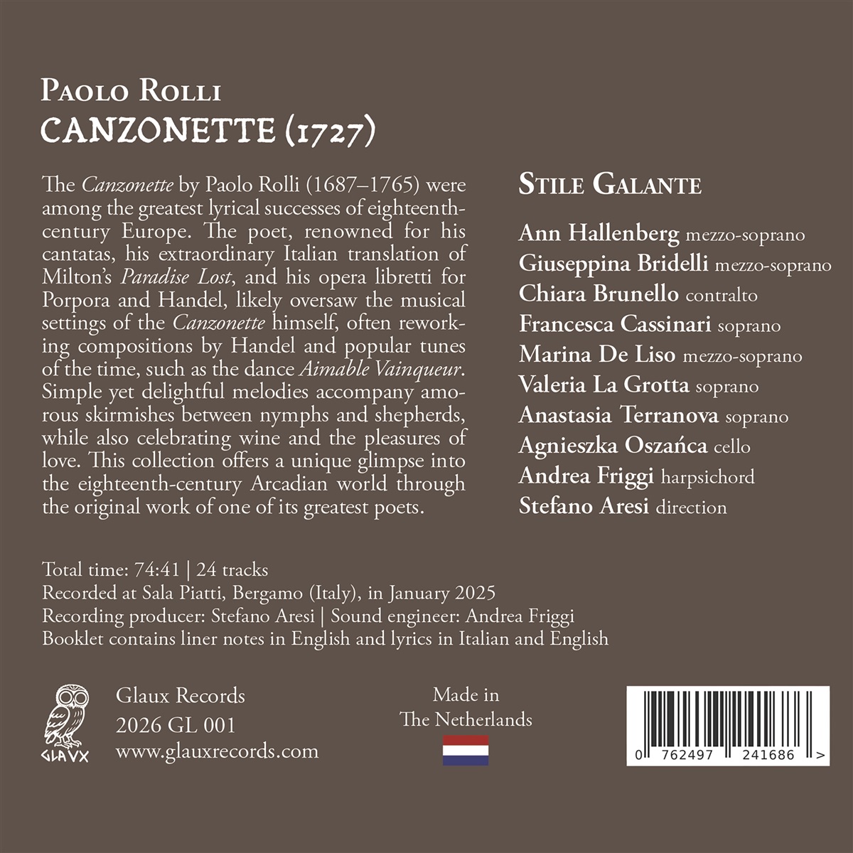 Die Canzonette von Paolo Rolli (1687–1765) gehörten zu den größten lyrischen Erfolgen des 18. Jahrhunderts in Europa. Der Dichter war bekannt für seine Kantaten, seine außergewöhnliche italienische Übersetzung von John Miltons „Paradise Lost“ und seine Opernlibretti, die er für Nicola Antonio Porpora und Georg Friedrich Händel schrieb. Seine Canzonette vertonte er mit eigenen kompositorischen Ideen und übernahme auch Melodien oder Werkteile im Parodieverfahren von Händel sowie beliebte Melodien der Zeit, wie beispielsweise den Tanz „Aimable Vainqueur“. Es sind einfache, aber reizvolle Melodien, die amouröse Begebenheiten zwischen Nymphen und Hirten illustrieren und sowohl den Wein als auch die Freuden der Liebe feiern. Diese Sammlung bietet einen einzigartigen Einblick in die arkadische Welt des 18. Jahrhunderts durch das Originalwerk eines seiner größten Dichter. Zur Besetzung in dieser Aufnahme gehören die berühmten Opernsängerinnen Ann Hallenberg und Giuseppina Bridelli. Das Album ist als Hardcover-Buch mit CD produziert, mit hochwertigen Druck und einem Design, das von klassischen Themen aus der frühen Geschichte der Fotografie inspiriert ist.
