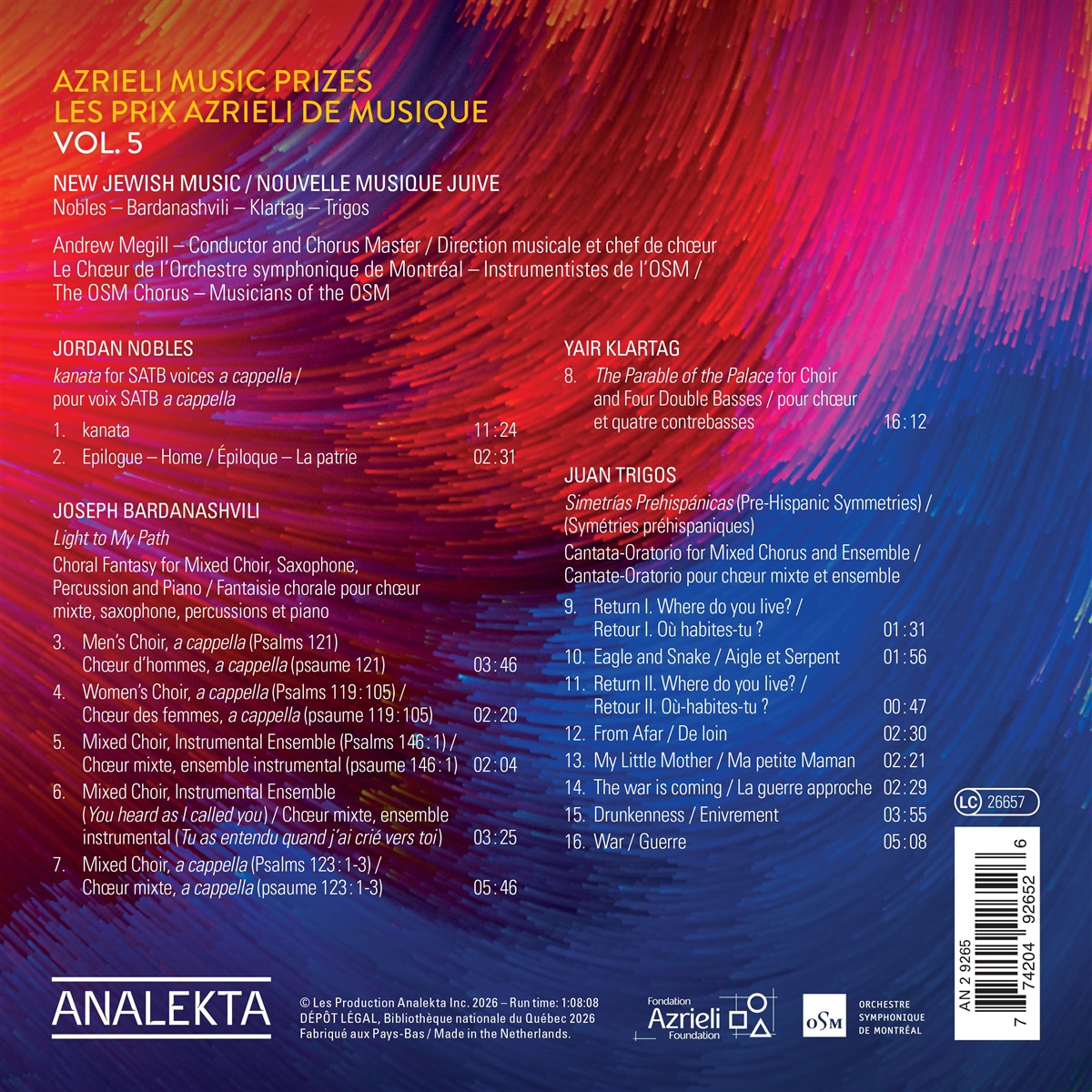 Die alle zwei Jahre verliehenen Azrieli Music Prizes wurden 2014 von der kanadischen Sängerin und Kantorin Sharon Azrieli für die Azrieli Foundation ins Leben gerufen, um herausragende Leistungen in der Komposition zu entdecken, zu fördern und hörbar zu machen und beinhaltet neben der Weltpremiere der Werke mit dem Orchestre symphonique de Montréal & OSM Chorus auch die professionelle Aufnahmen, die beim Label Analekta erscheinen.