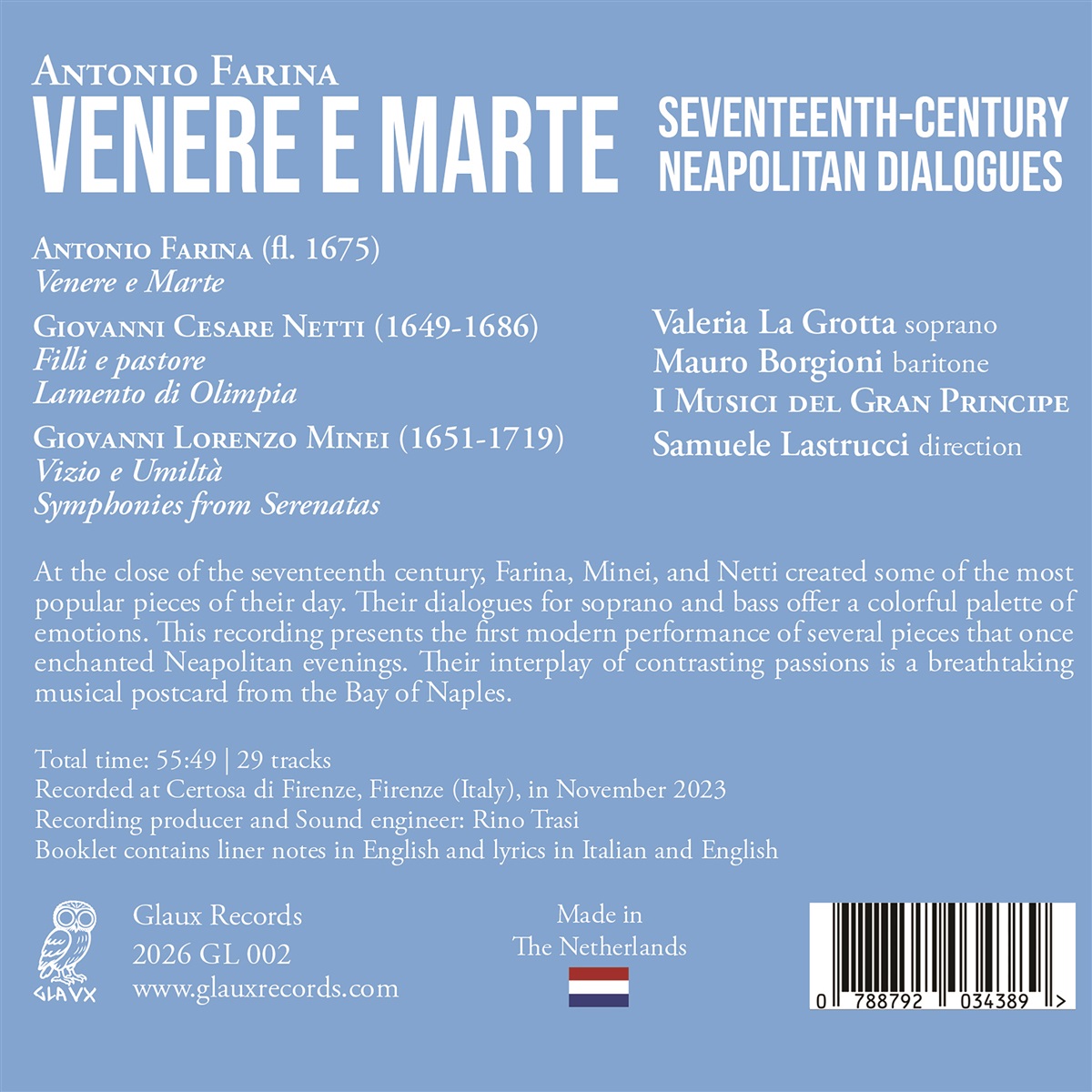 Am Ende des 17. Jahrhunderts schufen Antonio Farina, Giovanni Lorenzo Minei und Giovanni Cesare Netti einige der beliebtesten Werke ihrer Zeit. Ihre Dialoge für Sopran und Bass bieten eine farbenfrohe Palette an Emotionen. Diese Aufnahme präsentiert die erste moderne Aufführung mehrerer Stücke, die einst die neapolitanischen Abende verzauberten. Ihr Wechselspiel kontrastierender Leidenschaften ist eine atemberaubende musikalische Postkarte aus der Bucht von Neapel. Die Sopranistin Valeria La Grotta und der Bariton Mauro Borgioni, die diese wiederentdeckten Präziosen aufnahmen, gehören zu einer neuen Generation italienischer Barocksänger.