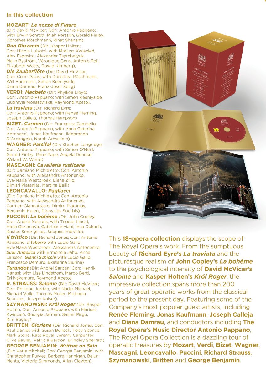 Diese 18 Opern umfassende Box zeigt die ganze Bandbreite der Royal Opera in London. Von der prachtvollen Schönheit von Richard Eyres „La traviata“ und dem malerischen Realismus von John Copleys „La bohème“ bis hin zur psychologischen Intensität von Kasper Holtens „Król Roger“ umspannt die Sammlung mehr als 200 Jahre Musikgeschichte. Zu hören sind u. a. Renée Fleming, Jonas Kaufmann, Barbara Hannigan, Joseph Calleja und Diana Damrau.