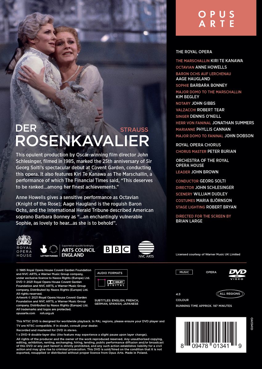Die nun endlich auf DVD erscheinende opulente Inszenierung von Richard Strauss' „Der Rosenkavalier“ des Oscar-prämierten Regisseurs John Schlesinger, die 1985 entstand, markierte den 25. Jahrestag von Georg Soltis spektakulärem Debüt am Covent Garden, bei dem er eben diese Oper dirigierte. Darüber hinaus ist Kiri Te Kanawa in der Rolle der Marschallin zu erleben, eine Darbietung, über die die Financial Times seinerzeit schwärmte: „Sie verdient es, zu ihren besten Leistungen gezählt zu werden“. Anne Howells überzeugt mit einer einfühlsamen Vorstellung als Octavian.