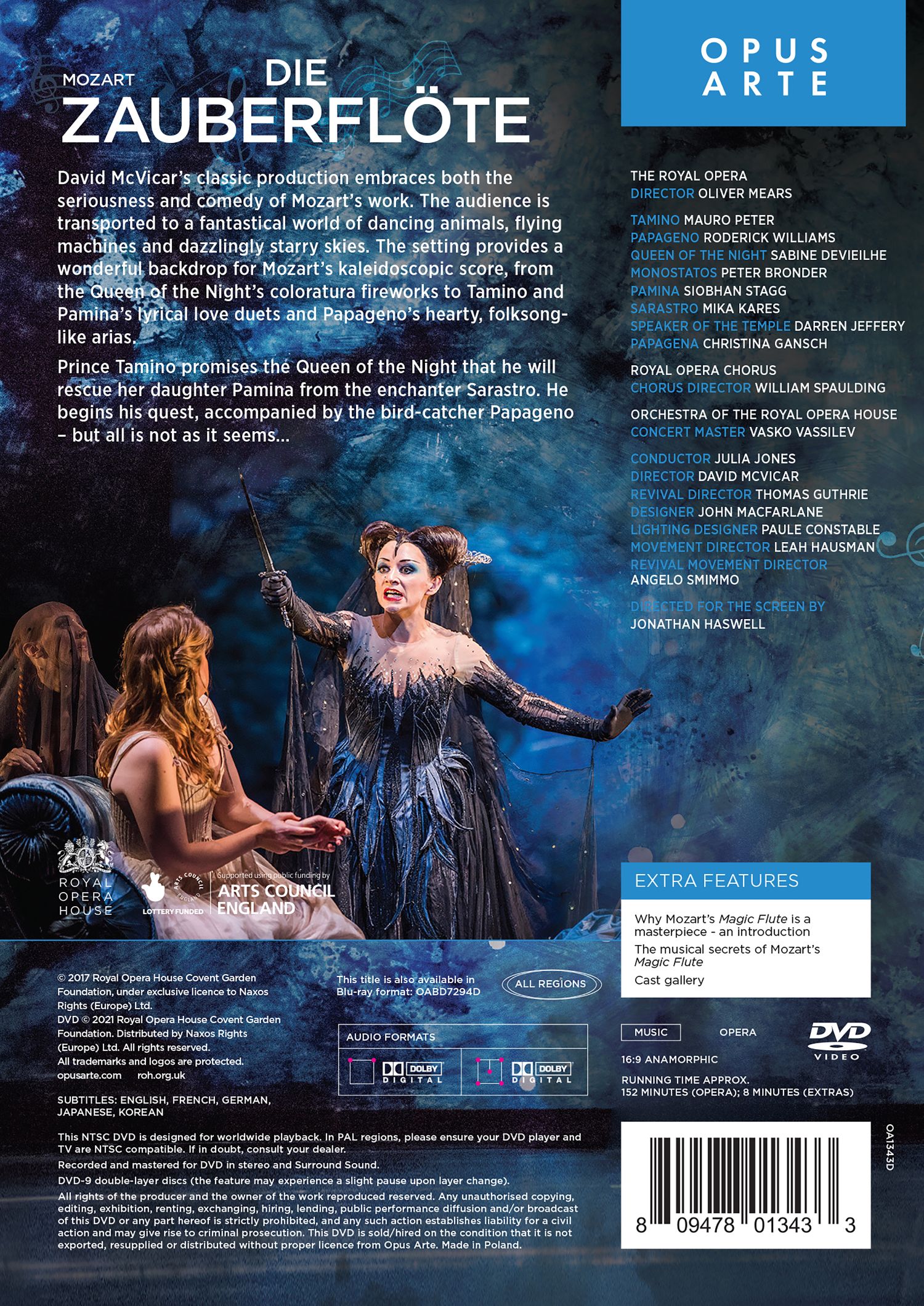 David McVicars Inszenierung der „Zauberflöte“ beleuchtet sowohl die ernsthaft-philosophische als auch die komödiantische Ebene von Mozarts Geniestreich. Das Publikum findet sich in einer fantastischen Welt mit tanzenden Tieren, Fabelwesen und fliegenden Maschinen unter einem schillernden Sternenhimmel wieder. Die spektakulären Kulissen bieten Mozarts kaleidoskopischen Partitur jede Menge Raum, vom Koloraturfeuerwerk der Königin der Nacht, den lyrischen Liebesduetten von Tamino und Pamina bis zu den volksliedhaften Arien von Papageno. Die großartige Besetzung macht den perfekten audiovisuellen Spaß aus London komplett.