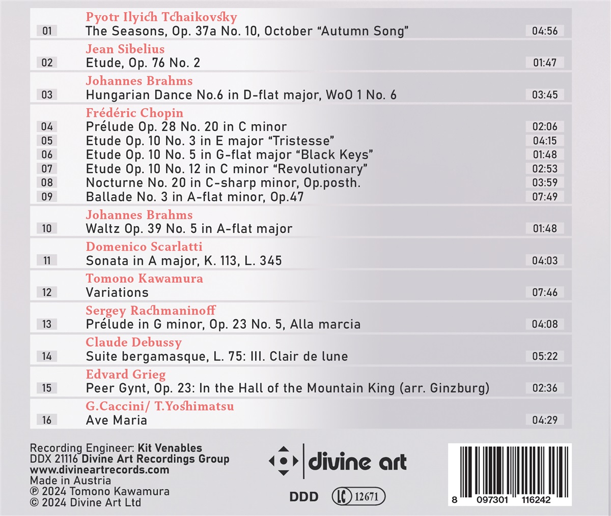 In ihrem neuen Album nimmt die gefeierte Pianistin Tomono Kawamura die Zuhörer mit auf eine Reise durch die Welt der klassischen Klaviermusik. Tomonos tiefe Verbindung zum Klavier wird in jedem Stück deutlich, in dem sie persönliche Favoriten mit zeitlosen Meisterwerken mischt. Das Album erkundet verschiedene Stilepochen mit einer Auswahl von Scarlatti, Rachmaninoff, Debussy und Grieg. Ein Höhepunkt von „Reminiscence“ ist Tomonos Originalkomposition „Variations“, die eine Brücke zwischen klassischer Form und zeitgenössischem Ausdruck schlägt. Tomono Kawamura wurde in Japan geboren, begann mit drei Jahren mit dem Klavierspiel und gab mit fünfzehn Jahren ihr Orchesterdebüt. Nachdem sie zahlreiche Wettbewerbe in Japan gewonnen hatte, erhielt sie ein Stipendium für ein Studium an der Royal Academy of Music in London, wo sie mit Auszeichnung abschloss. Tomono ist als Solistin in ganz Asien, Europa und Großbritannien aufgetreten.