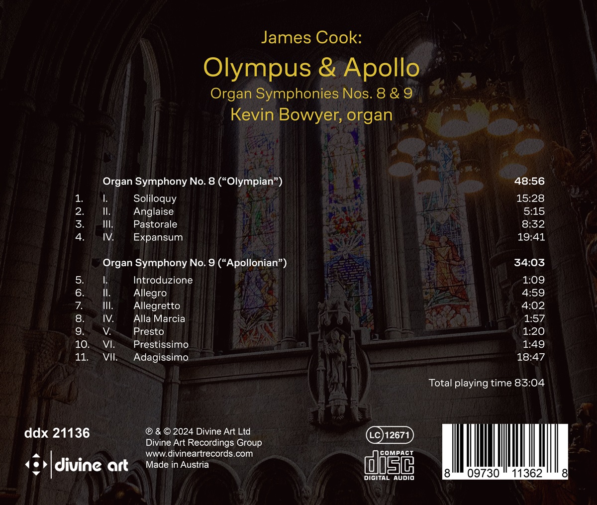 Das Album stellt zwei Orgelsinfonien des renommierten Komponisten James Cook vor, eingespielt vom renommierten britischen Organisten Kevin Bowyer. Bowyer erweckt Cooks Sinfonie Nr. 8 („Olympian“) und Sinfonie Nr. 9 („Apollonian“) zum Leben, beide entstanden 2006 und wurden 2011 orchestriert. Diese Aufnahme entstand 2023 an der majestätischen Orgel der Glasgow University Memorial Chapel. James Cook, geboren 1963, studierte Komposition an der Universität Oxford und hat seitdem eine Vielzahl von Musikstücken geschaffen, darunter Opernauszüge, geistliche Chorwerke und eine beeindruckende Sammlung von Orgelkompositionen. Diese Neuerscheinung ist das neunte Album von Cooks Musik bei Divine Art und zeigt seine kontinuierliche Weiterentwicklung als Komponist. Die „Olympian Symphony“, Cooks achte Sinfonie, ist ein ausladendes und bewegendes Stück, das vom Olymp, der mythischen Heimat der griechischen Götter, inspiriert ist. Die „Apollonian Symphony“, Cooks neunte Sinfonie, schildert die lebendigen und vielfältigen Erfahrungen eines langen Sommertages am Meer in der viktorianischen oder edwardianischen Zeit. Kevin Bowyer, der für sein unvergleichliches Können und seine gewagten Darbietungen gefeiert wird, hat das Publikum weltweit in seinen Bann gezogen. Der in Southend-on-Sea geborene Bowyer wurde an der Royal Academy of Music ausgebildet und verfeinerte sein Handwerk unter der Leitung von David Sanger weiter. Seine glanzvolle Karriere umfasst zahlreiche Auszeichnungen, wie die renommierte ‚Medal of the Royal College of Organists‘ und den „Lifetime Award“ der Deutschen Schallplattenkritik im Jahr 2023.
