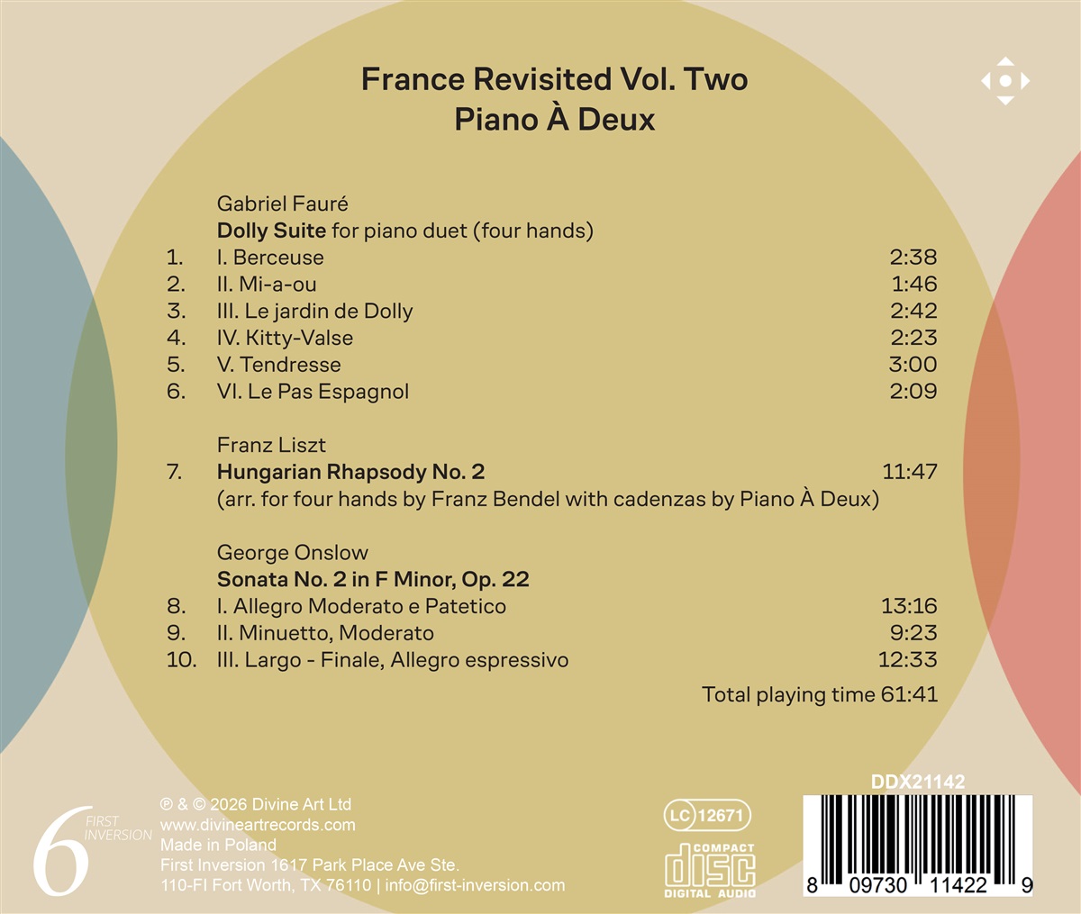 Das Klavier-Duo Piano Á Deux, bestehend aus Robert and Linda Stoodley, meldet sich mit Teil 2 der Reihe „France Revisited“ zurück. Die „Dolly-Suite“ von Gabriel Fauré besteht aus sechs Duetten zu vier Händen und wurde für die Tochter von Emma Bardac geschrieben, die später Claude Debussy heiratete. Der in Frankreich geborene, aber englischstämmige George Onslow fand mit seiner Musik bei Koryphäen wie Robert Schumann und Felix Mendelssohn Anklang und wurde von seinem Verleger und anderen Zeitgenossen zum „französischen Beethoven“ gekürt, fiel aber später in Ungnade. Bei ihren Recherchen über weniger bekannte Komponisten entdeckte Piano Á Deux in einer verstaubten Bibliotheksschublade die Duosonaten von Onslow. Die Duo-Sonate Opus 7 wurde für den ersten Teil von F„rance Revisited“ aufgenommen, und die Sonate Nr. 2 in f-Moll, Opus 22, ist in diesem zweiten Band zu hören. Sie wurde von Frédéric Chopin und Franz Liszt mehrfach aufgeführt, ist in großem Stil konzipiert, sinfonisch aufgebaut und spiegelt die Beethovenschen Aspekte von Onslows Stil wider. Liszts „Ungarische Rhapsodie“ Nr. 2 ist wahrscheinlich eines der bekanntesten Solostücke des Klavierrepertoires, von einem Komponisten, der weltweit immer noch verehrt wird. Piano Á Deux haben Franz Bendels Bearbeitung für vier Hände genommen, sie angepasst und ihre eigenen Kadenzen geschrieben, und so dem Stück eine neue persönlich Note gegeben. Als abenteuerlustiges Klavierduo mit einem breit gefächerten Repertoire, das sowohl große klassische Werke als auch eigene Bearbeitungen aus der Welt der Oper, des Films und des Musiktheaters umfasst, sind Piano À Deux bereits in vielen Ländern aufgetreten und sind gefeiert worden. Mit ihren Konzerten auf Kreuzfahrtschiffen haben sie sich inzwischen eine große Fangemeinde aus erfahrenen Konzertbesuchern und neuen Zuhörern erspielt, die von ihren einzigartigen Themenprogrammen, ihrem exquisiten Musizieren und ihrem mit Humor gepaarten Charisma begeistert sind.