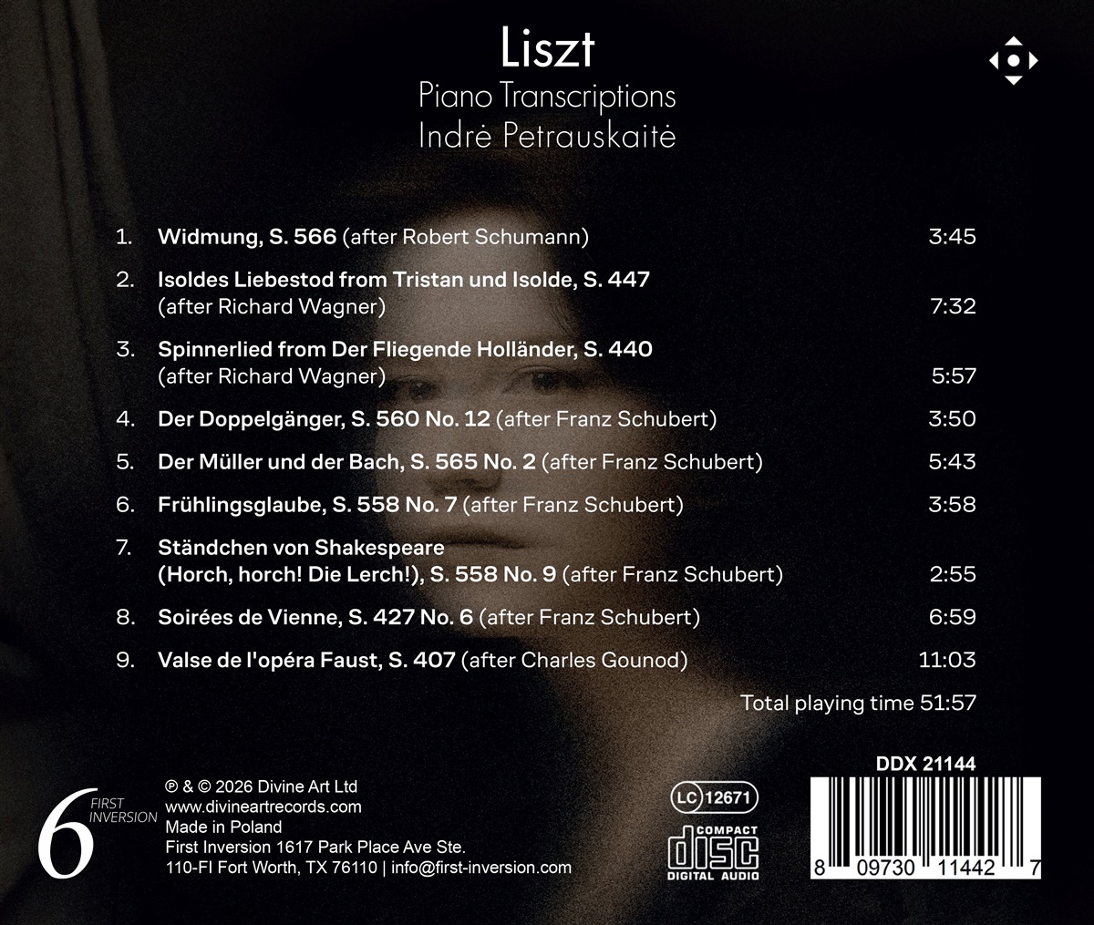 Dieses Album enthält beliebte Klaviertranskriptionen von Franz Liszt von Liedern und Arien von Robert Schumann, Richard Wagner, Franz Schubert und Charles Gounod, gespielt von der litauischen Pianistin Indrė Petrauskaitė. Während seines gesamten Lebens und durch sein Werk teilte Franz Liszt seine tiefe Liebe zur Musik seiner Komponistenkollegen und arrangierte ihre Werke für das Klavier, das wichtigste Instrument für das Musizieren zu Hause im 19. Jahrhundert. Er wollte den Menschen helfen, beliebte Musikwerke in privater Atmosphäre zu genießen, als der Zugang zu Orchestern und Konzerten noch eingeschränkt war. Liszt ist einer der größten Transkribenten des 19. Jahrhunderts und vielleicht sogar aller Zeiten. Fast die Hälfte seines Schaffens besteht aus Arrangements, von strengen Transkriptionen bis hin zu frei neu komponierten Paraphrasen. Pianistin Indrė Petrauskaitė kam schon als Kind mit Schuberts „Der Müller und der Bach“ in Berührung und dieses Stück ist die Inspiration für die Programmgestaltung dieses Albums, das 2007 aufgenommen wurde. Erst zu dieser Zeit begann ihr noch junges, unabhängiges Heimatland Litauen, Konzertflügel für seine schönen Konzertsäle anzuschaffen, wie beispielsweise den neuen Steinway in der Konzerthalle von Klaipėda, wo diese Aufnahme entstand. Nach ihrem Studium und Postgraduiertenstudium an der Litauischen Musikakademie trat Indrė in die Royal Academy of Music ein, wo sie ihren Masterabschluss absolvierte. Sie trat mit mehreren Orchestern in Litauen und anderen europäischen Ländern auf und gab zahlreiche Solo- und Kammermusikkonzerte. Heute lebt sie in London und verbindet Lehrtätigkeit und Konzerttätigkeit.
