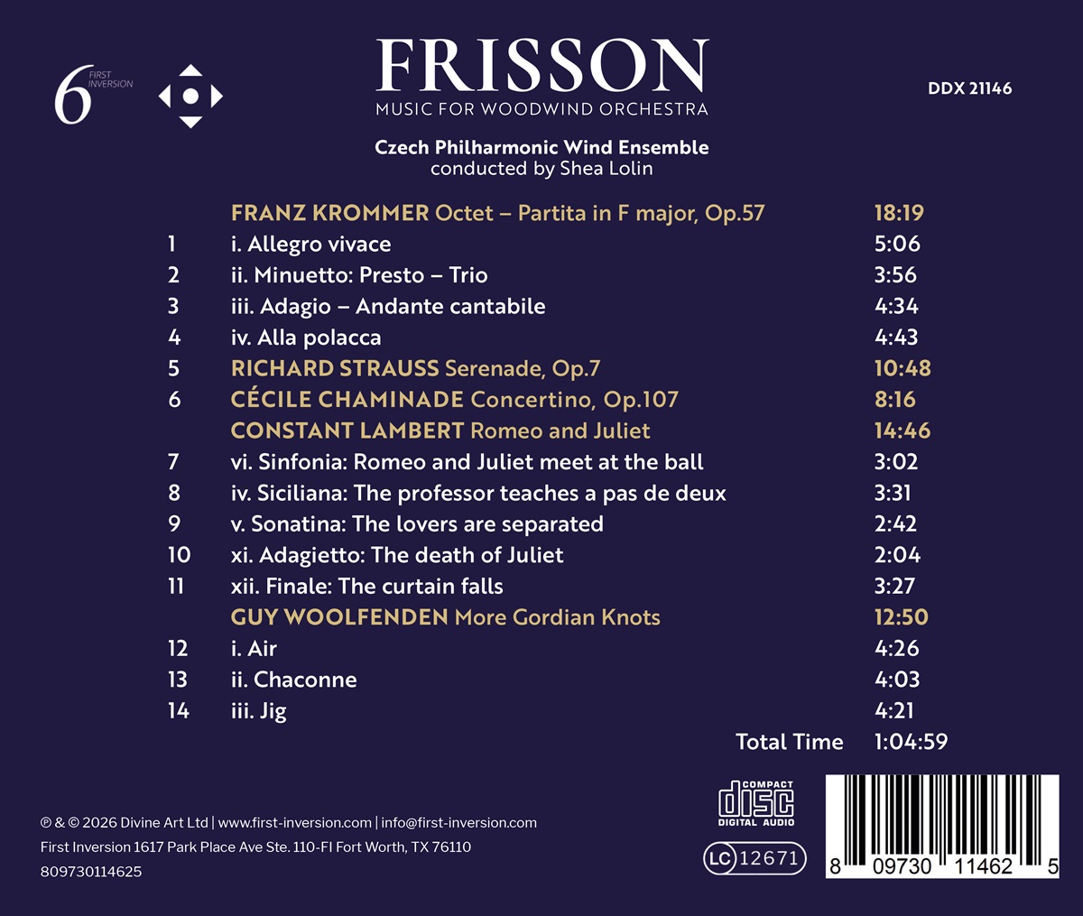Dirigent Shea Lolin präsentiert „Frisson“, ein spannendes neues Album mit Musik für Holzbläserorchester und seine dritte Aufnahme mit den Solisten der Tschechischen Philharmonie (Gramophone’s Orchestra of the Year 2024). „Frisson“ folgt auf die Veröffentlichung des bahnbrechenden Albums „Twisted Skyscape“, dem ersten Album, das sich ausschließlich der neuen Musik für Holzbläserorchester widmet, und „Chromosphere“, das sich auf zeitgenössisches Repertoire konzentriert. „Frisson“ markiert Shea Lolin’s 20-jähriges Engagement für das Holzbläserorchester und feiert dessen Entwicklung vom Genre der Harmoniemusik des frühen 18. Jahrhunderts – formelle Ensemblemusik für Holzbläserpaare – zu seiner modernen Form. Das Album enthält ein hervorragendes Programm mit Arrangements für Holzbläserensemble von Shea Lolin, die alle ursprünglich vom Bloomsbury Woodwind Ensemble in Auftrag gegeben wurden. Er erweitert Franz Krommers exquisites „Oktett – Partita in F-Dur“, Op. 57, und Richard Strauss' jugendliche „Serenade“, Op. 7, und schafft so eine breitere Klanglandschaft, ohne dabei deren Essenz zu verändern. Ebenfalls enthalten ist Cécile Chaminades beliebtes „Concertino“, Op. 107, arrangiert für Holzbläserorchester und mit der jungen Flötistin Fiona Sweeney aus Glasgow, die mit dieser Veröffentlichung ihr Debüt bei der Tschechischen Philharmonie gibt. Abgerundet wird das Album durch „More Gordian Knots“ von Guy Woolfenden OBE, eine temperamentvolle Neuinterpretation von Purcells Musik für „The Gordian Knot Unty’d“, die während Woolfendens bemerkenswerter 40-jähriger Zusammenarbeit mit der Royal Shakespeare Company entstand. Shea Lolin war schon in fast allen Bereichen der klassischen Musikbranche tätig, darunter als Musiker, Dirigent und Manager. Im Jahr 2025 wurde er zum Vorsitzenden der BASBWE (British Association of Symphonic Bands and Wind Ensembles) gewählt.