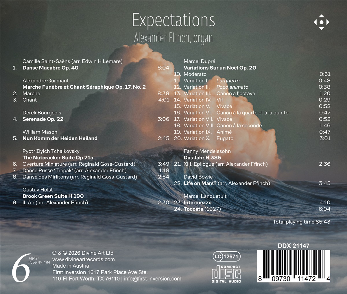 „Expectations“ von Organist Alexander Ffinch ist eine musikalische Reise durch die Festlichkeiten rund um Weihnachten mit Originalwerken und Arrangements, aufgenommen auf der prächtigen Orgel des Cheltenham College. Die vielfältigen Klangfarben der Orgel beflügeln die Fantasie und sorgen für ein wunderbar intensives Hörerlebnis. In dieser Hinsicht ist „Expectations“ ein perfekter Nachfolger und Begleitalbum zu Ffinchs 2024 erschienenem Album „Parallels“, das neben Originalwerken und Arrangements auch Musikstücke enthielt, die normalerweise nicht mit der Orgel in Verbindung gebracht werden. Ffinch beginnt die saisonale Reise an Halloween mit Camille Saint-Saëns' gruseligem „Danse Macabre“ in einer Transkription von E. H. Lemare. Alexandre Guilmants kraftvolles „Marche Funèbre et Chant Séraphique“ hält die düstere Atmosphäre aufrecht und schildert die Ankunft eines feierlichen Trauerzuges. Eine Neuinterpretation der Adventsmelodie „Non Komm der Heiden Heiland“ des jungen Komponisten William Mason stimmt uns auf die Weihnachtszeit ein. Weihnachten selbst wird mit Arrangements der „Ouvertüre“, des „Russischen Tanzes“ (Trépak) und „Tanz der Rohrflöten” aus Tschaikowskys festlichem Ballett „Der Nussknacker”, ergänzt durch die umwerfend einfallsreichen „Variations sur un Noël” von Marcel Dupré gefeiert. Der fesselnde „Epilog“ aus Fanny Mendelssohns „Das Jahr“ ist eine eindringliche und doch optimistische Darstellung des Mitternachtsschlags an Silvester. Zwei Werke des Meisterorganisten Marcel Lanquetuit, „Toccata“ und sein weniger bekanntes „Intermezzo“ folgen. Ffinch stellt die Frage nach Erwartungen mit David Bowies eindringlichem Song „Life on Mars?“, an dessen 10. Todestag. Alexander Ffinch hat sich als renommierter Organist mit Auftritten in Großbritannien, Europa, den USA und Asien etabliert. Nach vielen Radioauftritten stehen in Kürze Konzerte in Notre Dame und La Madeleine in Paris sowie regelmäßige Auftritte in Cheltenham und weitere Konzerte in Großbritannien und den USA auf dem Programm.