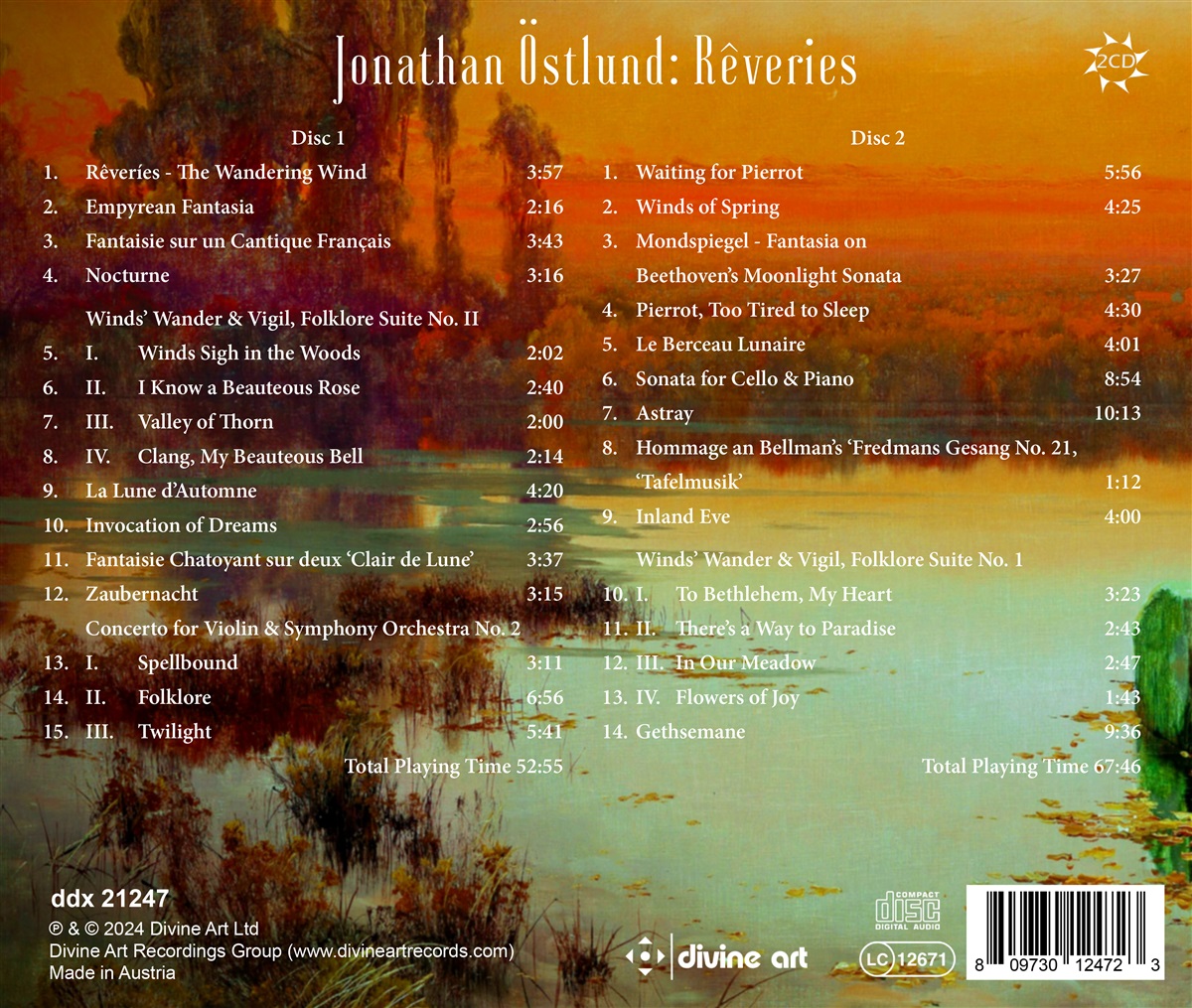 „Rêveries“ ist das mit Spannung erwartete neue Album des gefeierten Komponisten Jonathan Östlund. Östlund ist für seine stimmungsvollen und filmischen Kompositionen bekannt und verbindet klassische Eleganz mit zeitgenössischer Innovation. „Rêveries“ zeigt Östlunds Fähigkeit, eindringliche Klanglandschaften zu schaffen und die Fantasie anzuregen. Jeder Titel des Albums ist eine meisterhafte Mischung aus komplexer Orchestrierung und gefühlvollen Melodien, die Östlunds tiefes Verständnis für die Kraft und Subtilität von Musik widerspiegeln. Von den ausladenden, majestätischen Passagen bis hin zu den intimen, zarten Momenten fängt das Album ein Spektrum von Emotionen ein. Der schwedische Komponist hat fast 200 Werke vollendet, darunter Orchesterstücke und Violinkonzerte. Seine Musik, die von renommierten Musikern wie Einar Steen-Nokleberg und Yuri Revich aufgeführt wird, wird unter Divine Art Records veröffentlicht, mit gefeierten Alben wie „Lunaris“, „Voyages“, „Mistral“, „Imago“ und „Elysian“ aus dem Jahr 2023. Zu Östlunds Errungenschaften gehören Uraufführungen und CD-Veröffentlichungen mit den London Schubert Players, Auszeichnungen wie der Public Choice Award für seine Cellosonate und der 1. Preis des Leicester Symphony Orchestra für „Celebration Fanfare“. Seine Werke wurden in ganz Europa, Großbritannien und den USA aufgeführt.