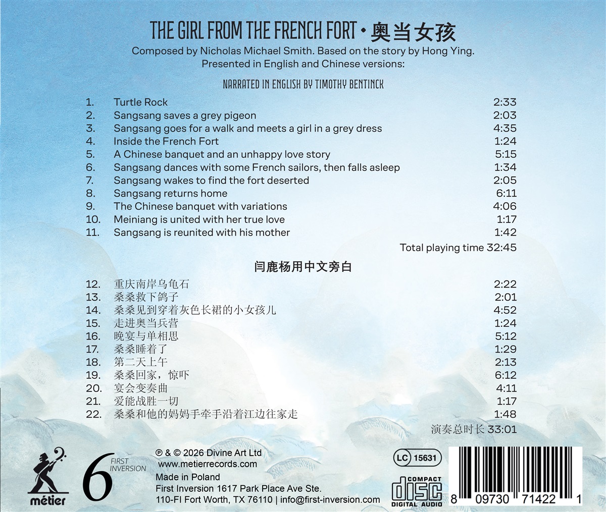 „The Girl from the French Fort“ ist ein bezauberndes orchestrales Werk des in Peking lebenden Komponisten und Dirigenten Nicholas Michael Smith, das auf einer Kindergeschichte der renommierten chinesischen Autorin Hong Ying basiert. Gerry Cornelius dirigiert die New Music Players. Die englische Version der Geschichte wird von Timothy Bentinck gesprochen, der vor allem für seine Rolle als David in der BBC Radio 4-Serie „The Archers“ bekannt ist. Das Album enthält außerdem eine Version der Aufnahme, die von Niki Yan, die in vielen chinesischen und internationalen Filmen und Fernsehserien mitgespielt hat, auf Mandarin erzählt wird. „The Girl from the French Fort“ spielt im Chongqing der 1970er Jahre und erzählt die Geschichte eines Jungen, der Freundschaft mit einem mysteriösen Mädchen schließt, das in der alten französischen Festung hoch über dem Jangtse lebt. Sie zieht ihn durch alte Türen in eine verborgene, traumhafte Welt, in der die Zeit anders verläuft und der Alltag voller Wunder und Seltsamkeiten ist. Das Stück steht in der Tradition von Sergei Prokofjews „Peter und der Wolf“ (ein Werk, mit dem es oft zusammen aufgeführt wird) und verbindet Erzählung mit orchestraler Klangfarbe. Nicholas Michael Smith lebt und arbeitet seit über dreißig Jahren in China und wurde 2011 für seine Verdienste um die Musik und die britisch-chinesischen Beziehungen zum Officer of the Order of the British Empire (OBE) ernannt. Zu seinen Erfolgen zählen die chinesische Erstaufführung von Georg Friedrich Händels „Messias“ und die Gründung mehrerer Chöre und Orchester. Er hat eine unverwechselbare und komplexe musikalische Sprache: Manchmal schweben seine Melodielinien frei um ein tonales Zentrum herum und bewegen sich in der Kreisförmigkeit der pentatonischen Tonleiter, die den Kern vieler traditioneller chinesischer Musikstücke bildet; an anderen Stellen wird seine Musik von den harmonischen Spannungen und chromatischen Entwicklungen der westlichen klassischen Tradition angetrieben.
