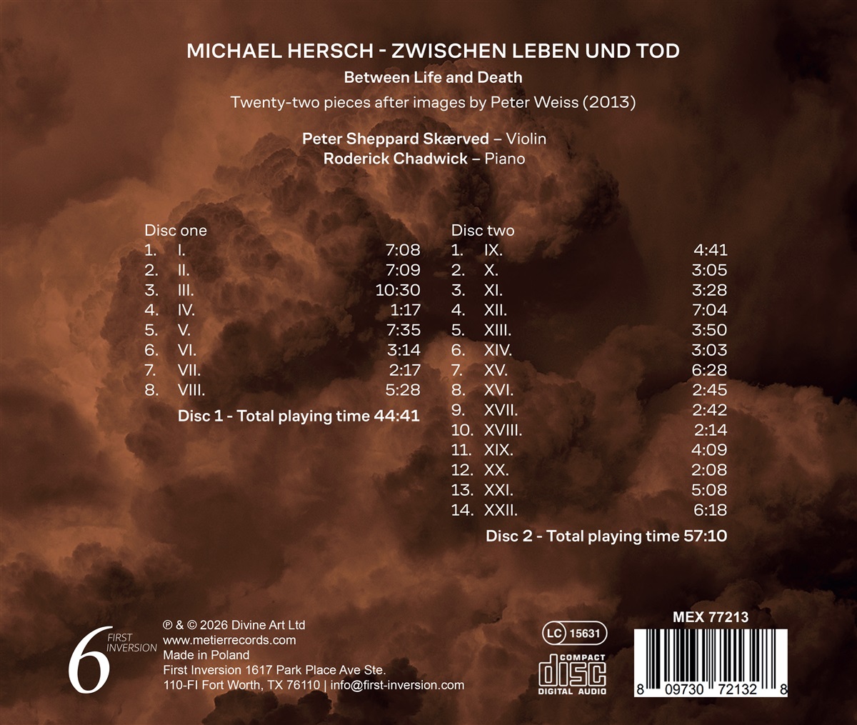 Der Geiger Peter Sheppard Skærved und der Pianist Roderick Chadwick interpretieren Michael Herschs monumentales Kammermusikwerk „Zwischen Leben und Tod“. Die New York Times beschrieb Herschs Musik als ‚zutiefst fesselnd und emotional transformierende Musik....claustrophobisch und erheiternd zugleich, mit Momenten erhabener Schönheit, eingebettet in ein Dickicht dunkler Virtuosität’. Im Januar dieses Jahres wurde er als erster Empfänger des John Hopkins University Affiliated Fellowship an der American Academy in Rom ausgewählt. „Zwischen Leben und Tod“ ist ein verblüffender und bewegender 22-sätziger Zyklus für Violine und Klavier, der in Anlehnung an Gemälde des surrealistischen deutschen Künstlers, Schriftstellers und Filmemachers Peter Weiss geschrieben wurde, wobei jeder Satz einem bestimmten Bild entspricht. Mit seiner Dauer von 100 Minuten ist es eines der längsten Werke für Violine und Klavier. Peter Weiss ist vor allem als Autor von erschütternden und oft verstörenden Bühnendramen bekannt. Weiss' wenig bekannte Gemälde und Zeichnungen weisen viele der gleichen Merkmale auf: Einsamkeit, Gewalt und Trauer (Themen wie Irrenhäuser, Krieg, Gefängnisse, Kannibalismus), aber auch zutiefst meditative Bilder (ein Streichquartett, ein Gartenkonzert, ein Junge auf dem Gelände eines Landhauses). Hersch fand Weiss' Spektrum von Farbe und Bewegung, von Proportionen und Abständen besonders musikalisch, und „Zwischen Leben und Tod“ ist eine tiefe und viszerale Auseinandersetzung mit eben diesen Erkundungen. Das Ergebnis ist ein komplexes, reichhaltiges und vielschichtiges Werk mit extremen Tempi, Dynamiken und Techniken, das den Ausführenden enorme körperliche Anstrengungen abverlangt, aber auch sehr lohnend ist. Der Geiger Peter Sheppard Skærved kennt Michael Hersch seit über zwanzig Jahren und arbeitet eng mit ihm zusammen; dies ist ihre erste gemeinsame Aufnahme. Michael Hersch ist Professor für Komposition am Peabody Institute und ein Komponist von „kompromissloser Brillanz“ (The Washington Post). Sein Werk umfasst Opern, Theater-, Kammer-, Vokal- und Orchesterwerke, die in ganz Europa und den USA aufgeführt werden.