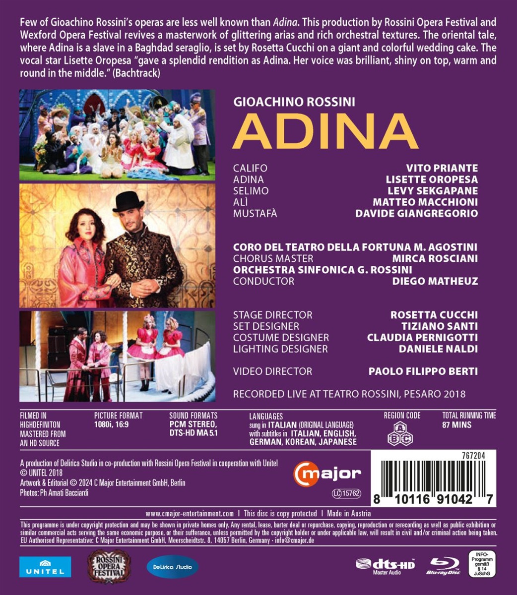 Nur wenige Opern von Gioachino Rossini sind weniger bekannt als „Adina“, ein Werk, das von Anfang an Probleme bereitete. Als Rossini es 1818 fertiggestellt hatte, fand die geplante Inszenierung nie statt – es ist nicht bekannt, warum. Es dauerte acht Jahre, bis es endlich eine Premiere gab. Es ist keine weitere Aufführung im 19. Jahrhundert bekannt. Diese Produktion des Rossini Opera Festivals und des Wexford Opera Festivals lässt ein Meisterwerk glanzvoller Arien und reichhaltiger Orchesterstrukturen wiederaufleben. Die im Orient spielende Geschichte, in der Adina eine Sklavin in einem Serail in Bagdad ist, wird von Rosetta Cucchi auf einer riesigen und farbenfrohen Hochzeitstorte in Szene gesetzt – nicht das einzige humoristische Element. Die Presse war begeistert vom Gesangsstar Lisette Oropesa, die in den Koloraturpassagen brillierte, sowie von Vito Priante mit seinem tiefen Bass und seiner beachtlichen Beweglichkeit in den Läufen. Diego Matheuz, ein vielseitiger Operndirigent, leitet das Orchestra Sinfonica G. Rossini. Matheuz arbeitete bereits an der Deutschen Oper und der Staatsoper Berlin, am Liceu in Barcelona, am Palau des Arts in Valencia, am Teatro São Carlos in Lissabon, beim Maggio Musicale Fiorentino, beim Rossini Festival Pesaro und am Teatro Regio di Torino. Dies ist eine Weltersteinspielung auf Video.